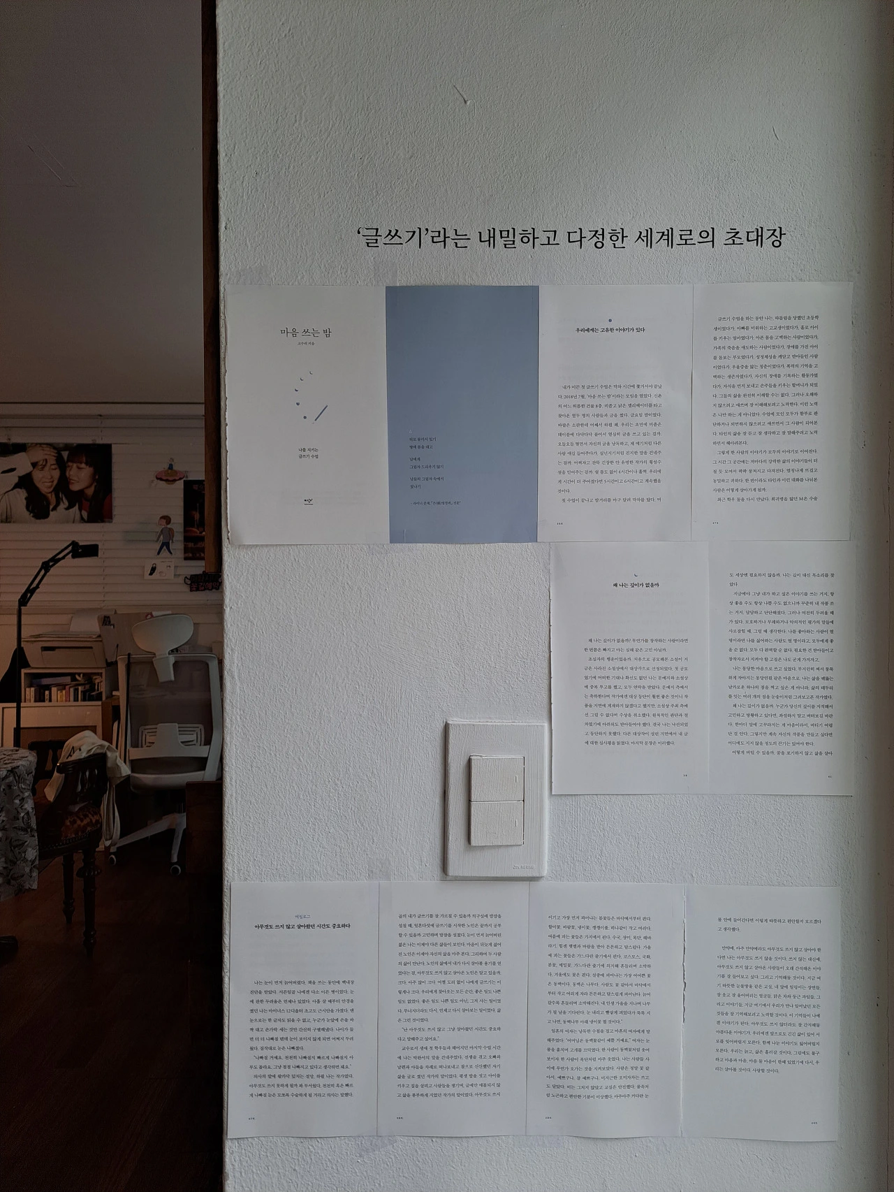 돌이켜보면 “작가가 매일 읽고 쓰는 작업 공간을 재현”하는 전시라는 점에서, 고수리 작가는 누구보다 이 전시에 잘 어울리는 작가다. 곁에서 본 그는 정말 정성스럽게 쓰고, 생각하고, 또 그렇게 사는 작가이기도 하므로. 잘 사는 것이 잘 쓰는 것의 토대가 된다는 말을 믿게 만드는 사람.