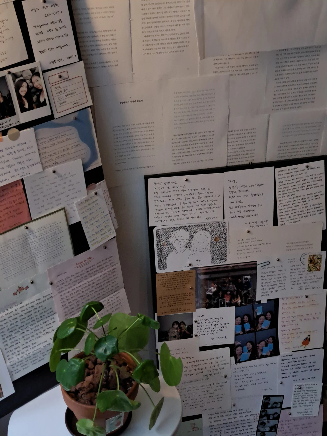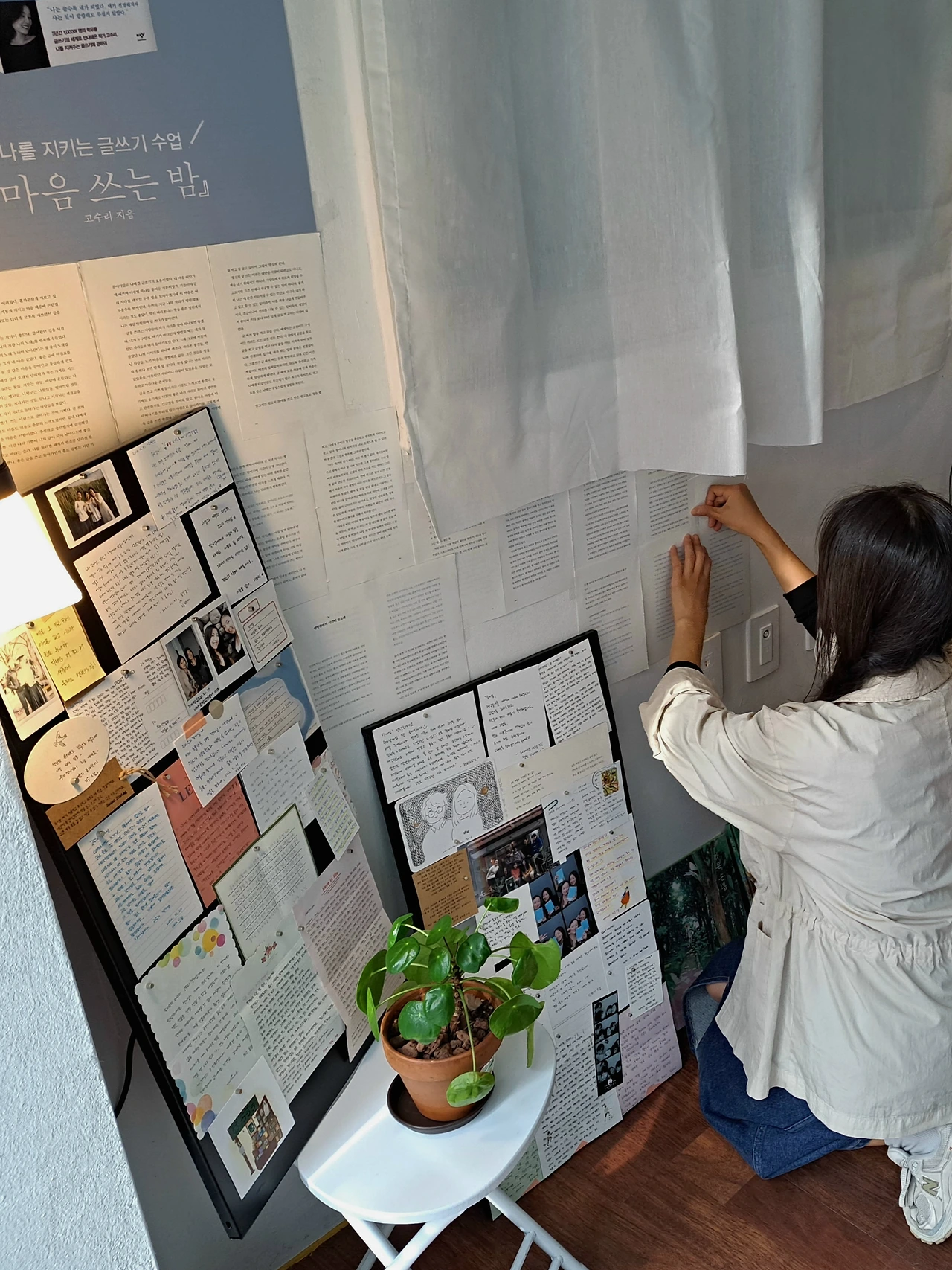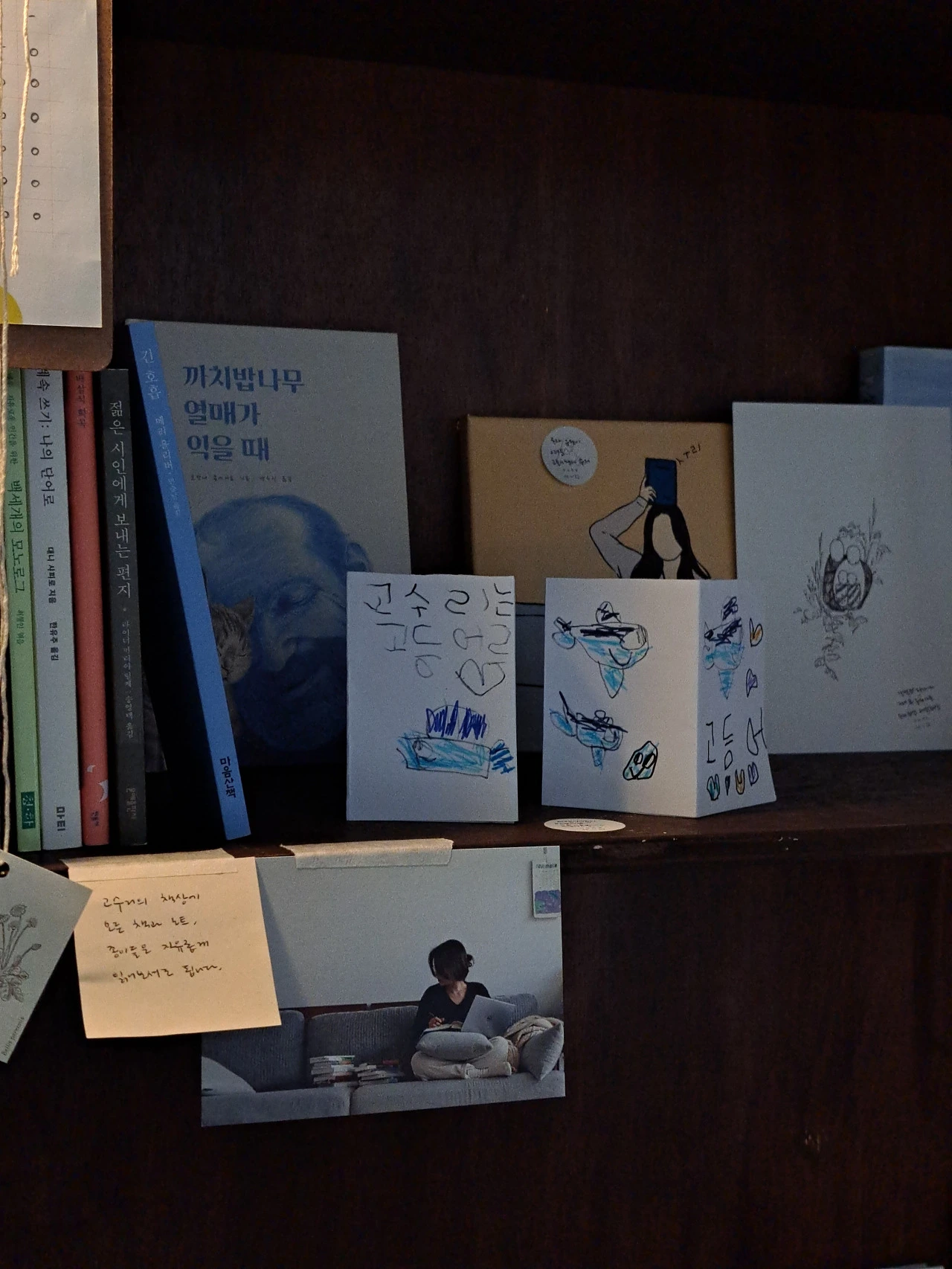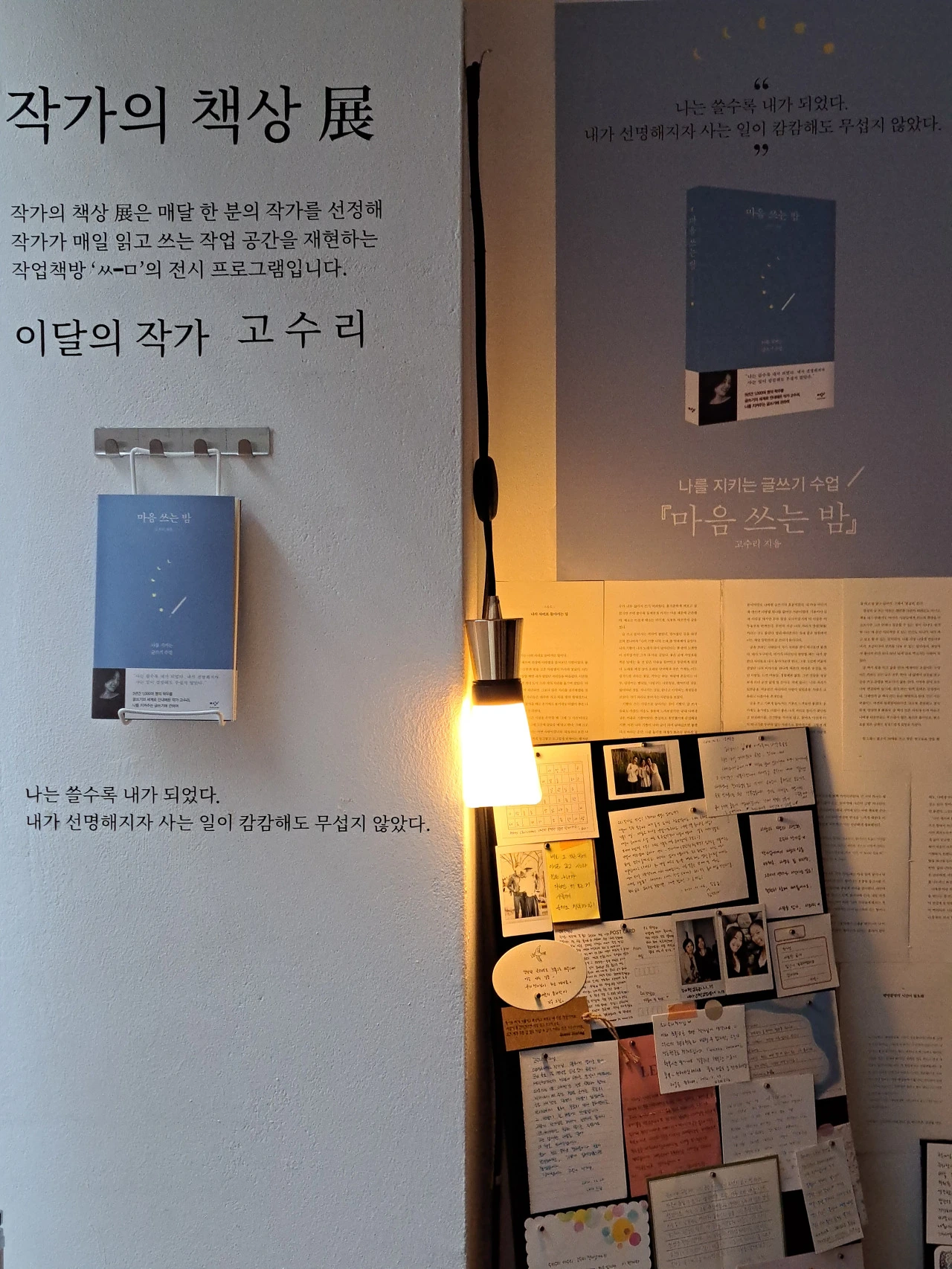 7일, 오늘 금요일에는 12-5시까지 상주해요. 작가의 책상전에는 작가 고수리의 기록들과 독자들의 기록이 빼곡해요. 책과 펜과 문장과 마음으로 이어진 페이지들을 읽어주세요. 혹시 나의 자취를 발견한다면 뭉클해하기를. 책상에 놓인 물건들도 하나하나 사연이 스며 있답니다.