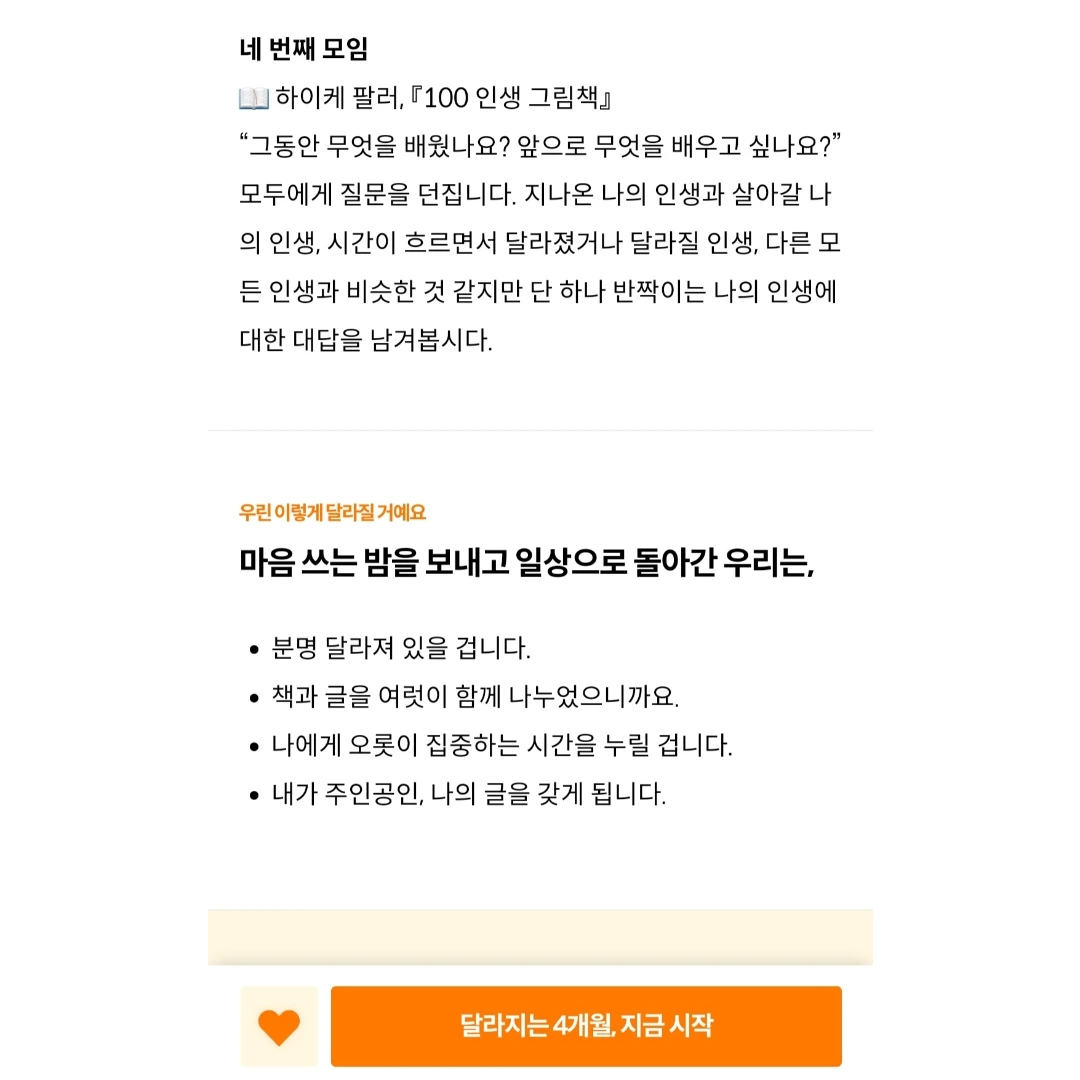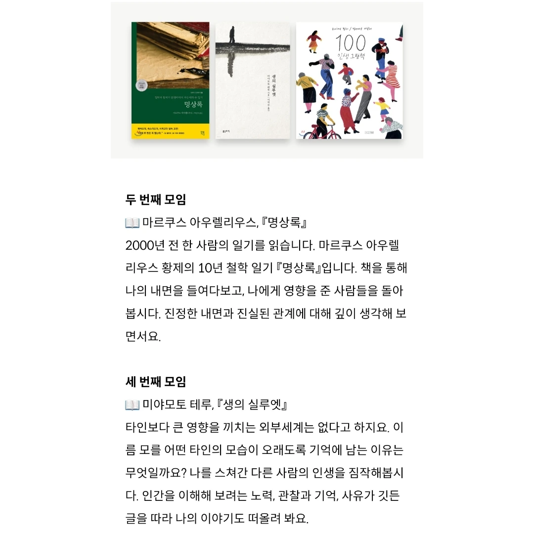 4개월 동안 우리는 이런 책들과 마음 쓰는 밤을 보낼 거예요. 올해 초 저에게 부낭이 되어주었던 책 <아무것도 하지 않는 법>을 시작으로, <명상록>, <생의 실루엣>, <100 인생 그림책>을 통해 자기 자신의 이야기를 탐구합니다.