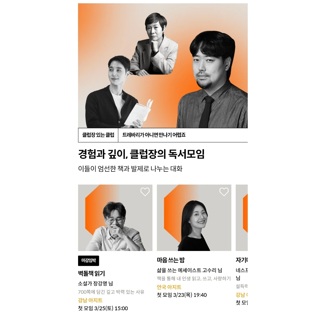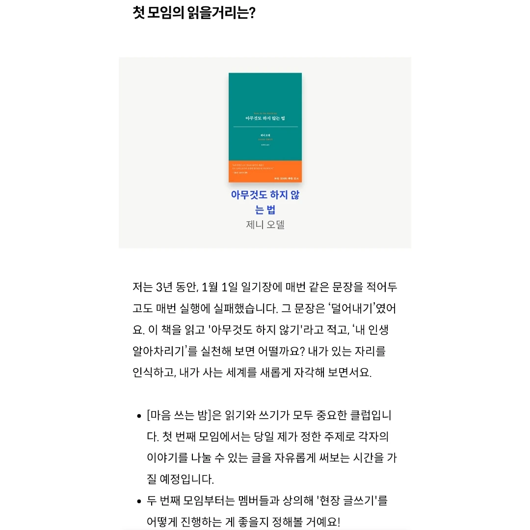 [마음 쓰는 밤]은 읽기와 쓰기가 모두 중요한 클럽입니다. 3월 23일 첫 번째 모임에서는 당일 제가 정한 주제로 각자의 이야기를 나눌 수 있는 글을 자유롭게 써보고요. 이후 모임은 멤버들과 상의하여 현장 글쓰기를 진행할 예정입니다. 책을 통해 내 인생 읽고, 쓰고, 사랑하는 시간. 우리 같이 마음 쓰는 밤 보낼까요 :)