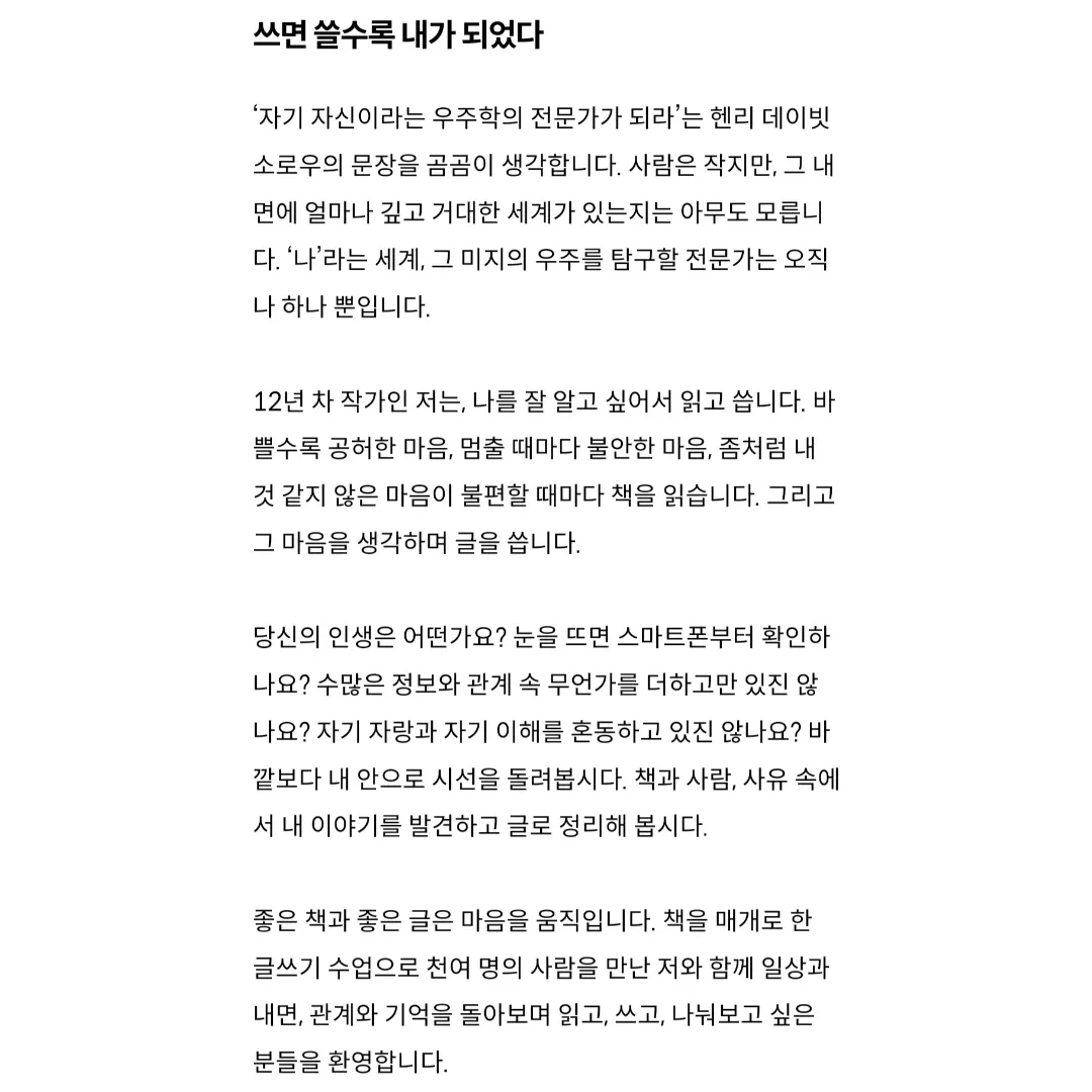 내 안으로 시선을 돌려봅시다. 책과 사람, 사유 속에서 내 이야기를 발견하고 글로 정리해 봅시다. 좋은 책과 좋은 글은 마음을 움직입니다. 책을 매개로 한 글쓰기 수업으로 천여 명의 사람을 만난 저와 함께 일상과 내면, 관계와 기억을 돌아보며 읽고, 쓰고, 나눠보고 싶은 분들을 환영합니다.
