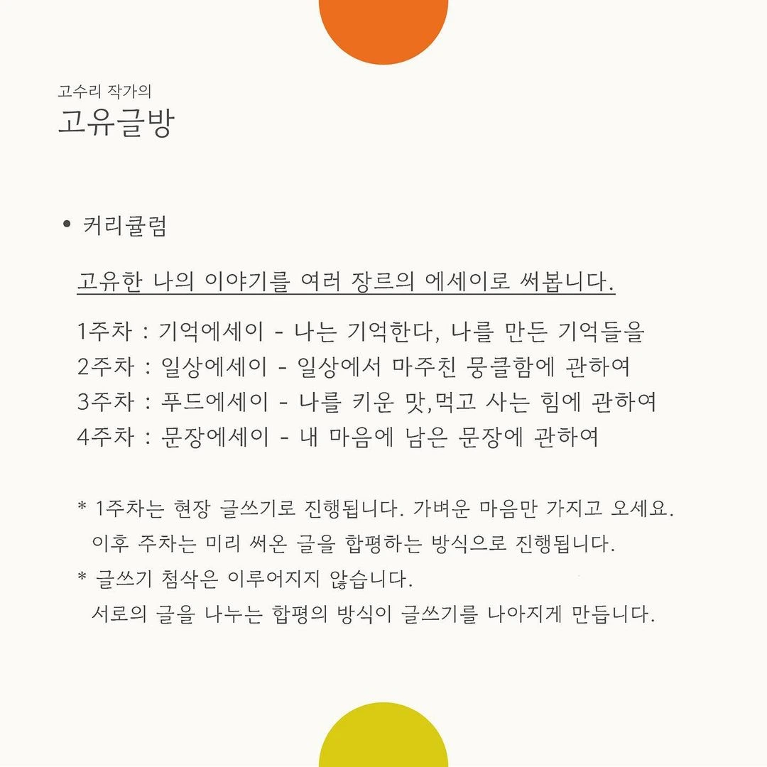 고수리 작가입니다. 3년 만에 고유글방 활짝 엽니다. 나의 이야기로 여러 장르 에세이를 써보는 한낮의 소규모 글쓰기 모임입니다. 매 회차 합평으로 진행되며 12년 차 에세이 작가의 실질적인 조언을 전해드립니다. 우리 볕뉘같은 안전한 글쓰기 공동체를 꾸려 보아요 :)