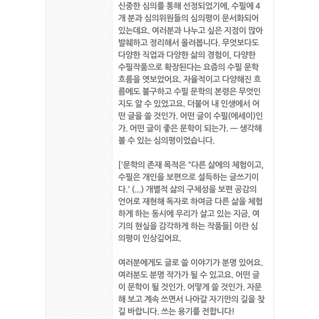 수필분야 선정도서들과 심의평을 살펴보다가 '어떤 글이 문학이 되는가' 학우들에게 공유한 이야기를 남깁니다. 용기 내어 내 인생 꺼내 쓰는 이들에게 도움이 되기를. 마음을 보냅니다 :)