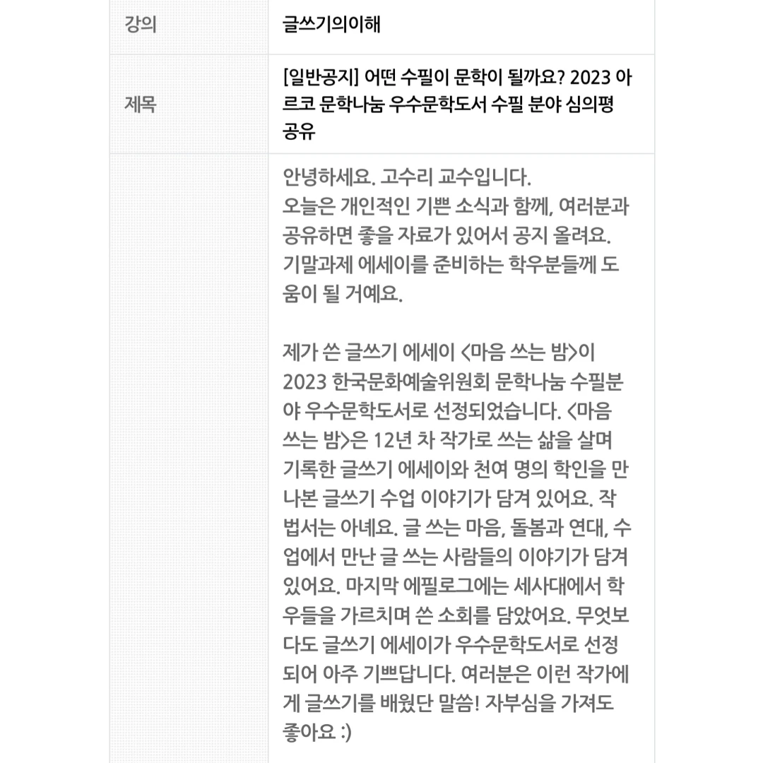 기쁜 소식을 전해요. <마음 쓰는 밤>이 한국문화예술위원회 2023년 1차 문학나눔도서로 선정되었습니다. 무엇보다 글쓰기 에세이가 우수문학도서로 선정되어 기뻐요.