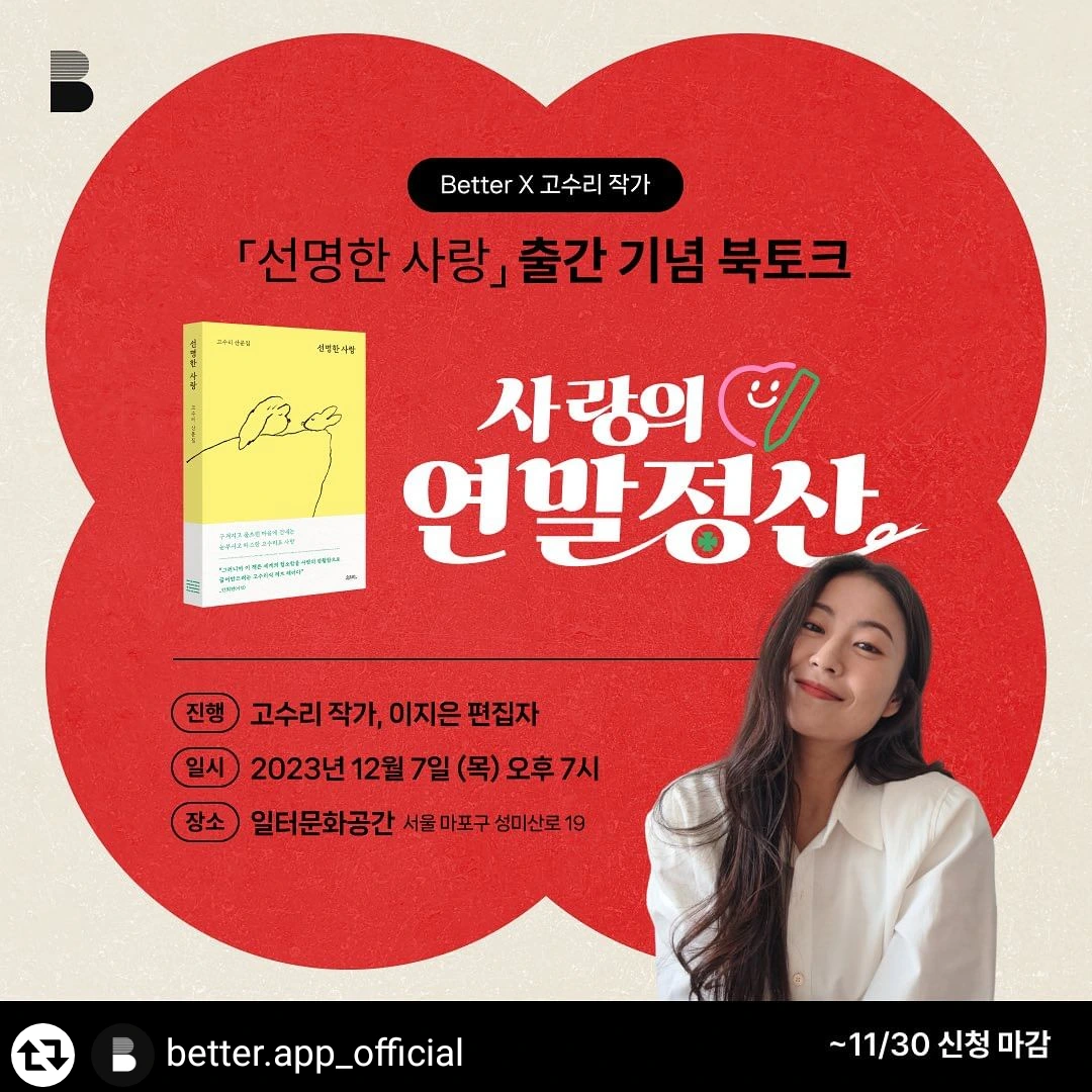 ✶ Better X 고수리 작가 북토크 '사랑의 연말정산' 참가 신청서 고수리 작가님의 「선명한 사랑」 출간 기념 북토크 <사랑의 연말정산>에 베터러 여러분을 초대합니다! ✨ 눈부시고 따뜻한 사랑을 쓰는 고수리 작가, 베터와 함께 올 한 해 나를 스쳐 간 사랑을