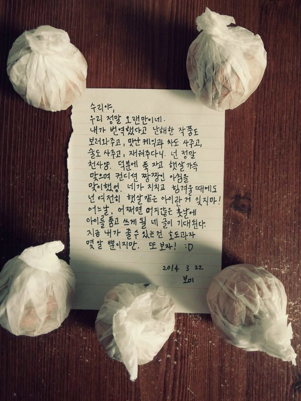 [수리야. 네가 지치고 힘겨울 때도 넌 여전히 햇살 같은 아이란 거 잊지 마. 훗날 쓰게 될 네 글이 기대된다. 지금 내가 줄 수 있는 건 호두과자 몇 알뿐이지만, 또 보자.]