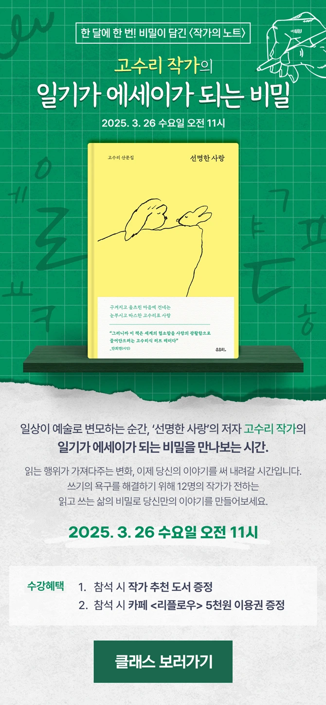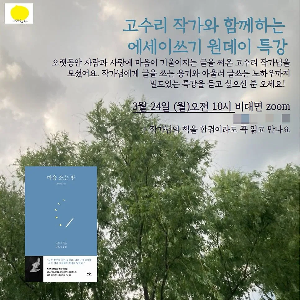 3월, 고수리 작가가 진행하는 글쓰기 수업 안내 드려요. 그간 돌봄과 작업으로 글쓰기 수업을 자주 열지 못했는데요. 애정하는 책방들의 제안으로 온오프라인 원데이 클래스를 열어봅니다.