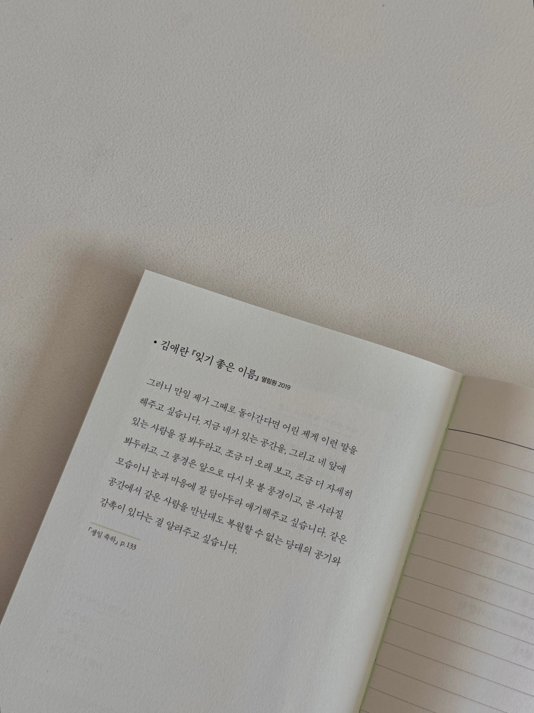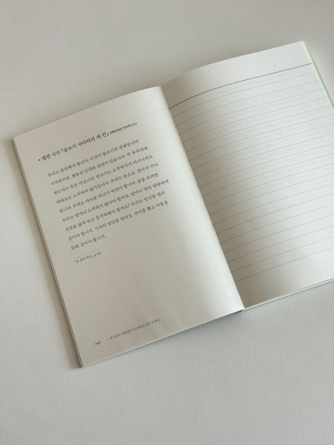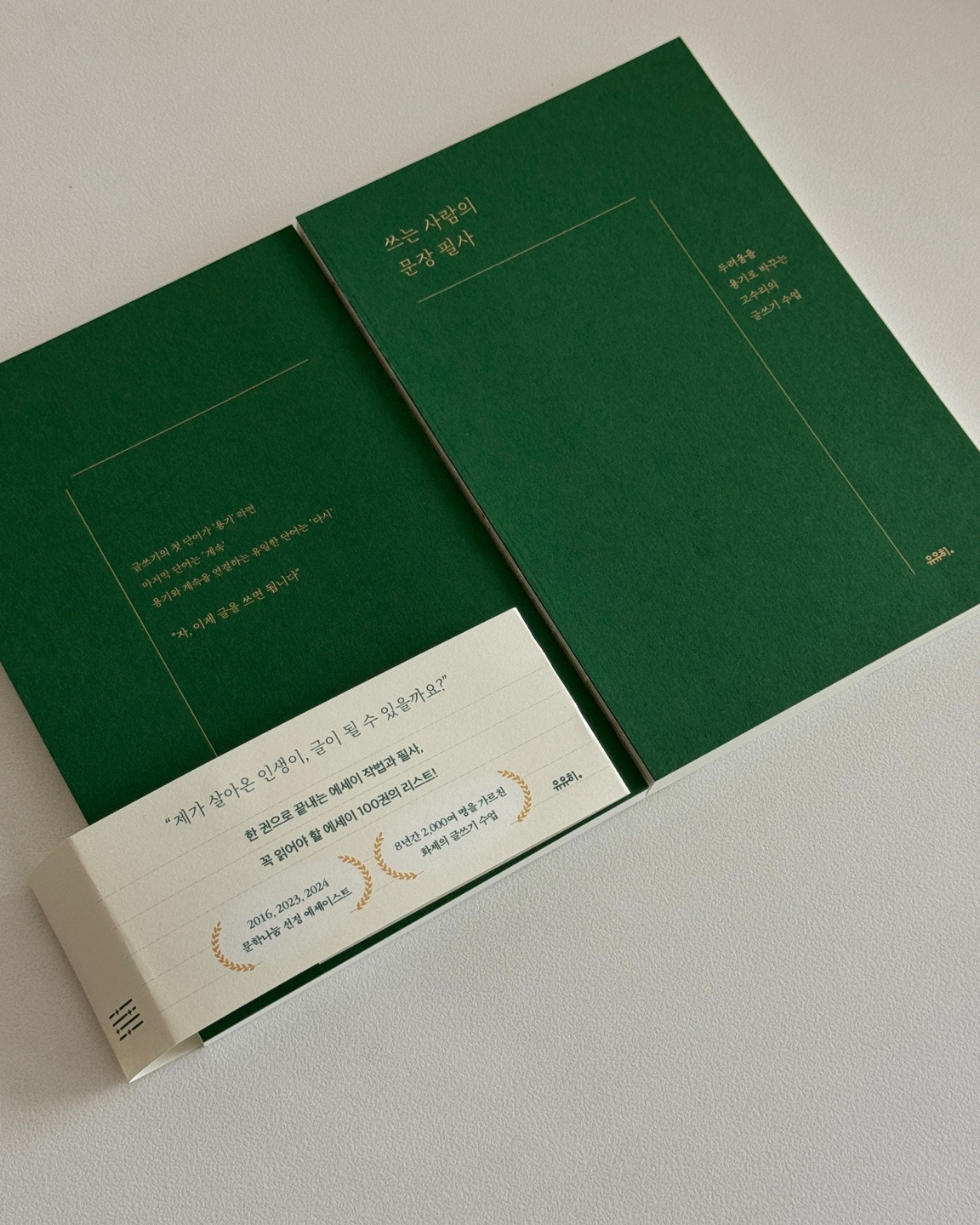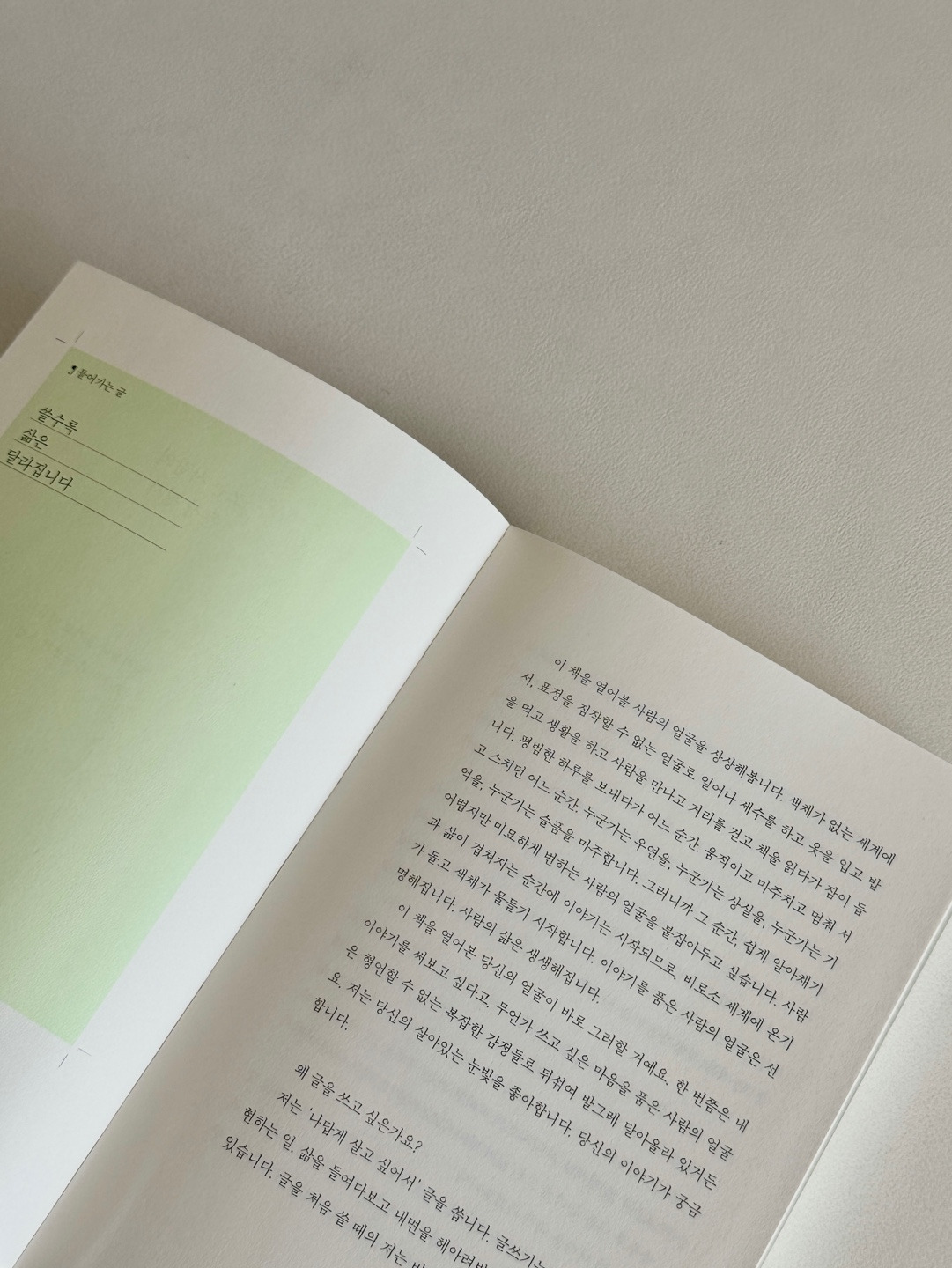 굳건한 작은 나무처럼 단단하고 아름다운 초록책 [쓰는 사람의 문장 필사] ㅡ 띠지를 벗기면 튼튼한 실제본으로 어느 페이지라도 반듯하게 펼쳐져요. 필사노트처럼 가지고 다닐 수 있답니다.