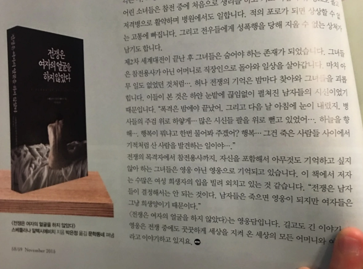 ‘전쟁은 여자의 얼굴을 하지 않았다’ 책 리뷰와 억새꽃이 만개한 '정선 민둥산' 풍경, 슬로시티 ‘청송’에 대한 아름다운 사진과 글들. 매거진을 만드는 사람들의 정성이 한 장 한 장 느껴져서 매우 좋았다.