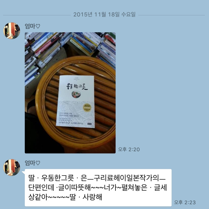 딸, ‘우동 한 그릇’은 구리 료헤이라는 일본 작가의 단편인데 글이 따뜻해. 네가 펼쳐놓은 글세상 같아. 딸, 사랑해.