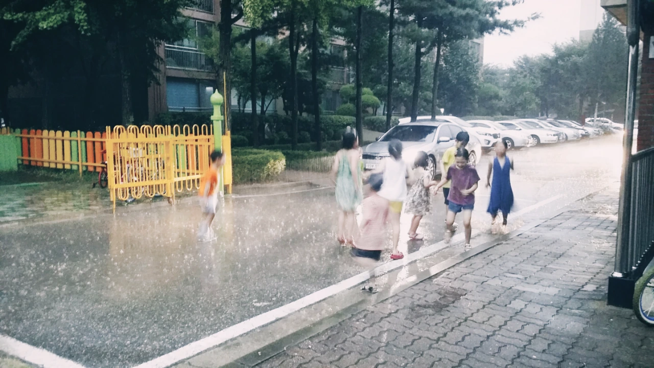 퇴근하고 잔뜩 찌푸린 하늘 위로 잿빛 구름이 낮게 드리워져 있다. 오늘도 아이들은 유치원 앞 놀이터를 지키고 있다. 한두 방울 빗방울이 떨어지는가 싶더니 힘차게 빗줄기가 쏟아진다. 빗소리가 얼마나 좋은지 피하지 않고 비를 맞아 보자는 아이들과 엄마들은 빗속으로 몸을 던졌다.