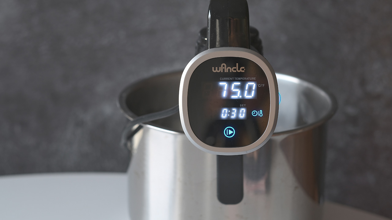 75도의 따뜻한 물에 30분간 저온 조리합니다.