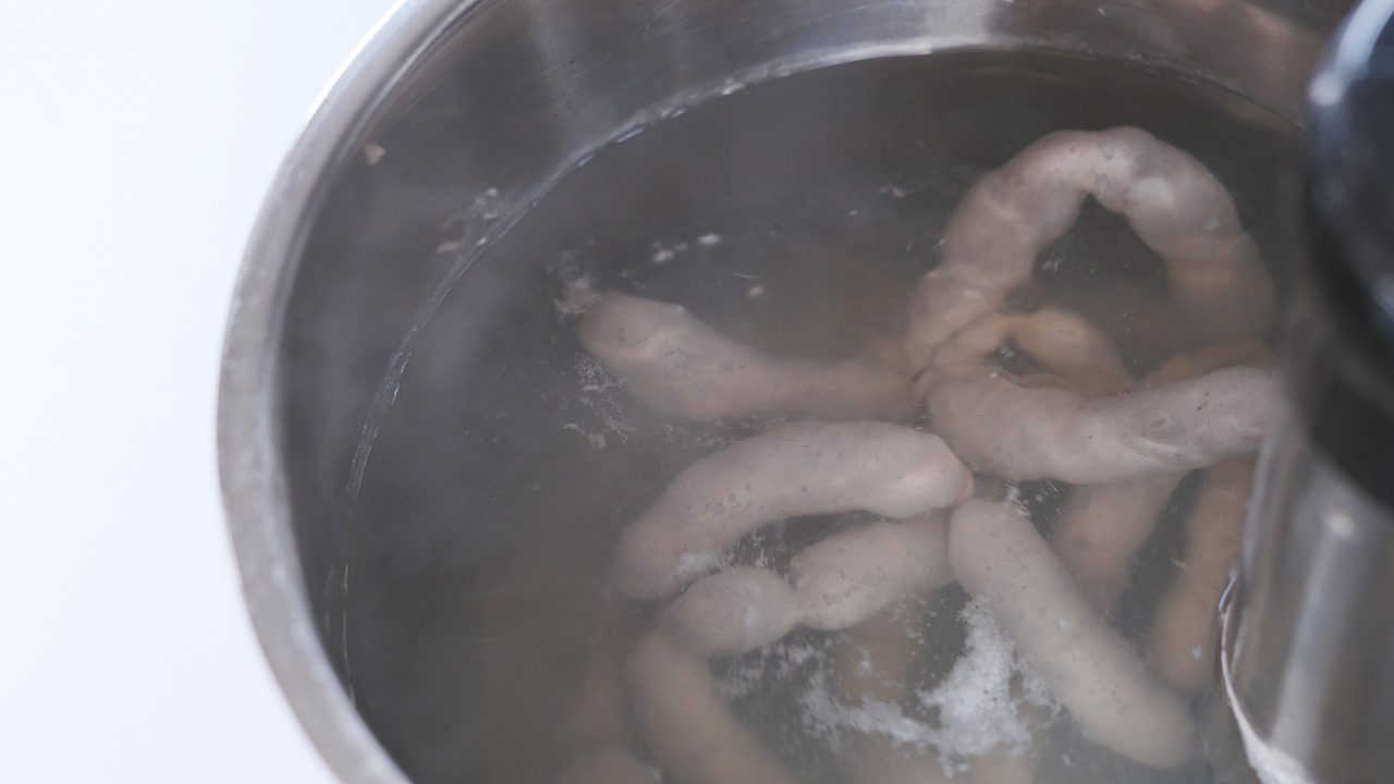 얼음물에 살짝 담근 뒤 건져내어 마디마디 잘라줍니다. 이렇게 만들어진 소시지는 일주일간 냉장보관 가능합니다.