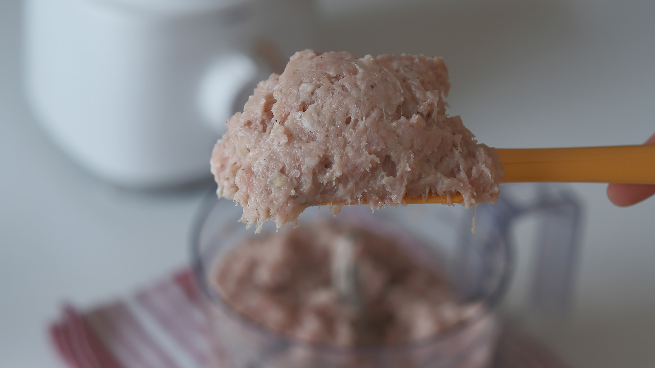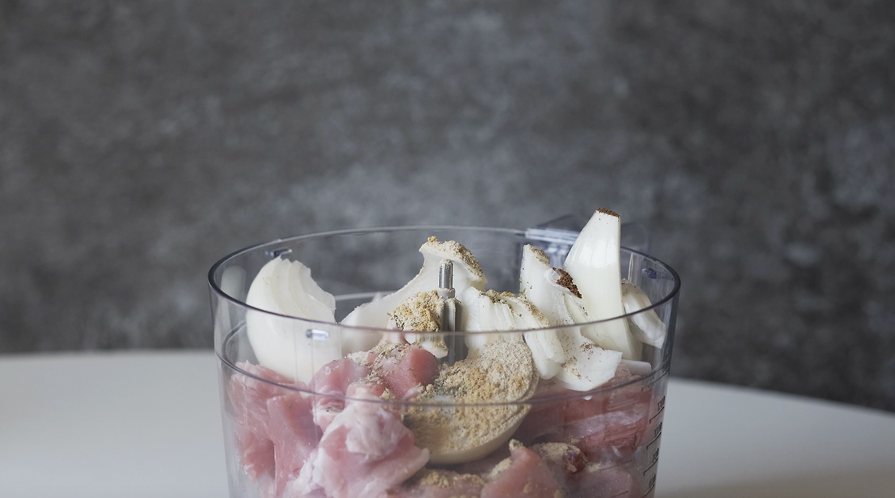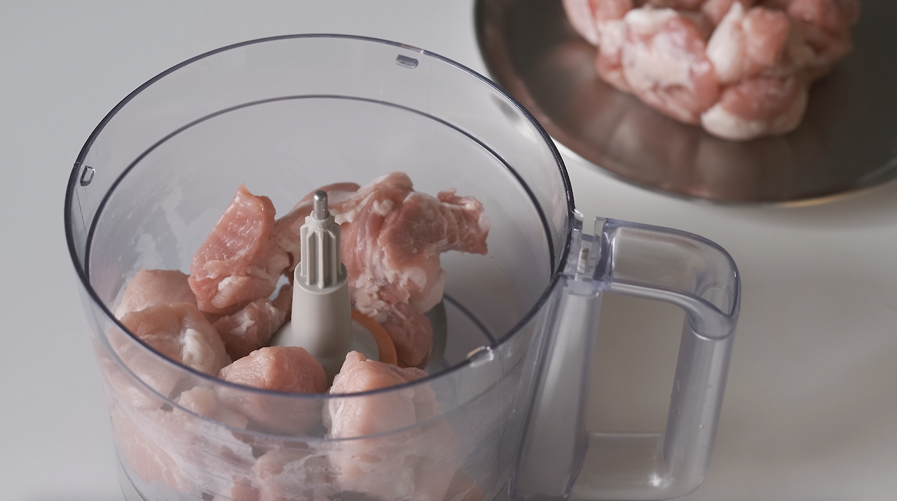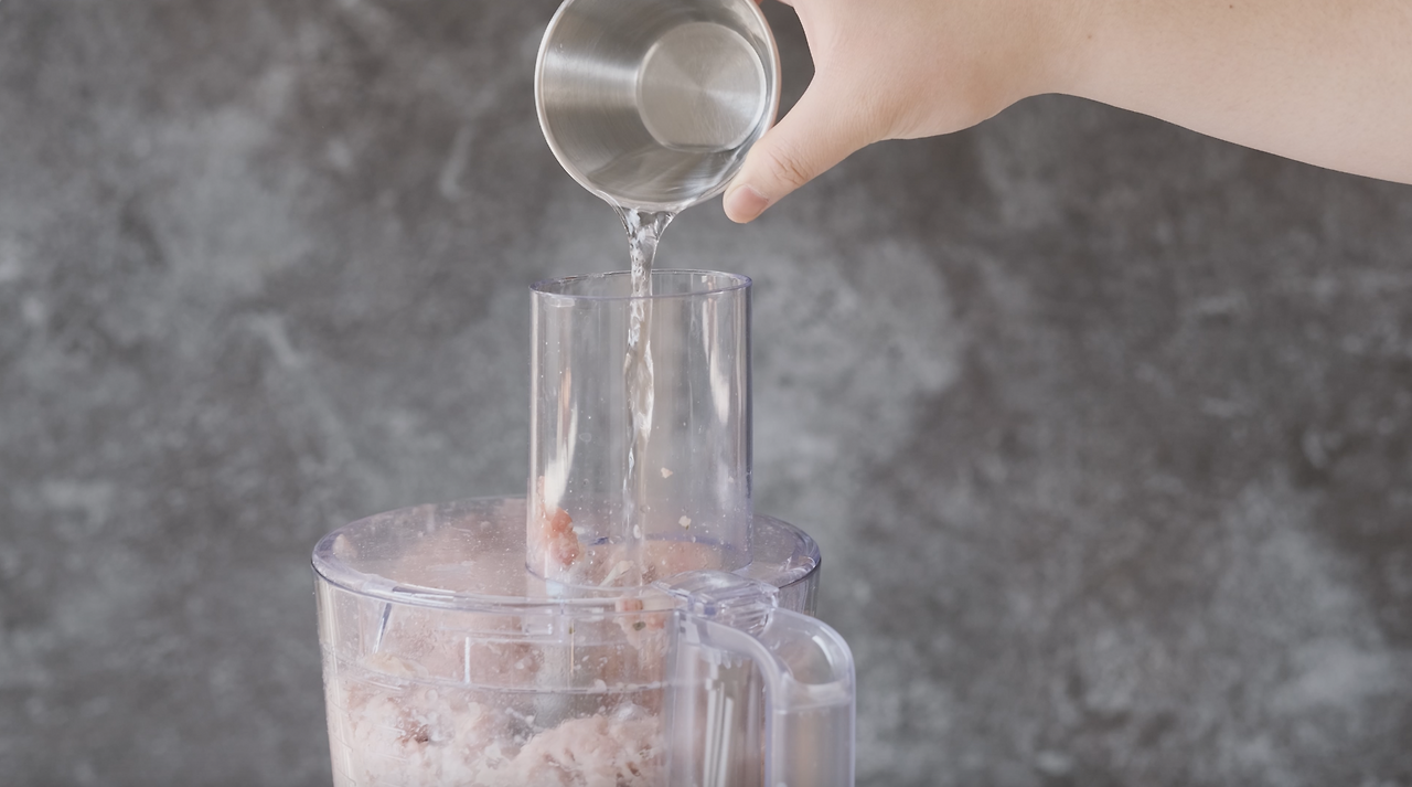 푸드프로세서를 돌릴 때는 한 번에 돌리지 마시고 10번에 나누어 끊어가며 돌립니다. 고기 입자가 절반 크기로 줄어들면 그때 기계를 완전히 돌려줍니다. 고기가 갈리다가 서로 뭉치기 시작하면 준비해둔 차가운 물 120ml를 넣어줍니다.