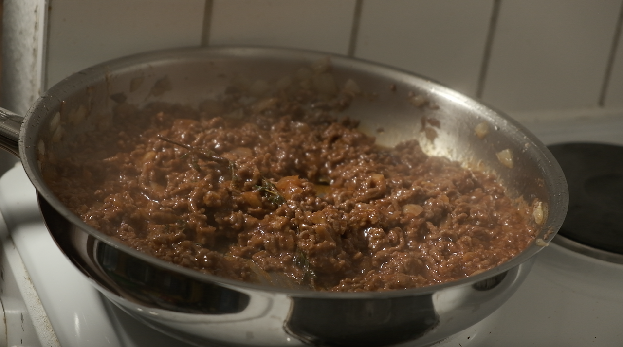 고기 소스의 농도가 잡힐 때까지 볶은 뒤 넣어두었던 타임, 월계수 잎을 제거해줍니다.
