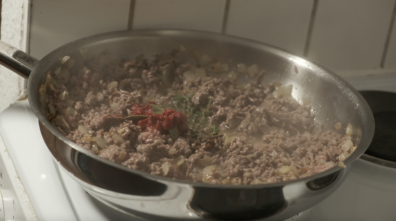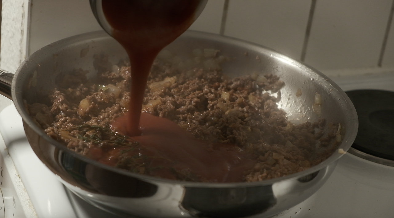 수분이 날아가 고기 소스가 팬 바닥에 눌어붙기 시작하면 중불로 줄인 뒤 토마토퓌레 250ml를 넣어줍니다.