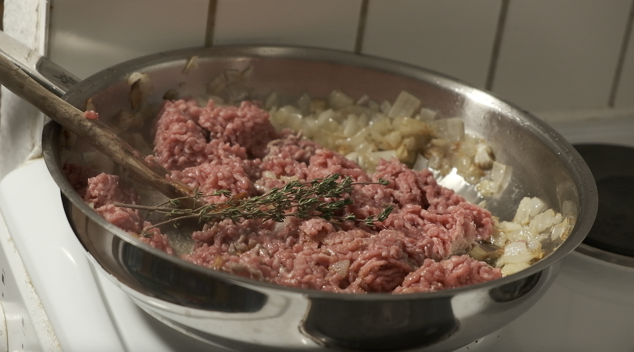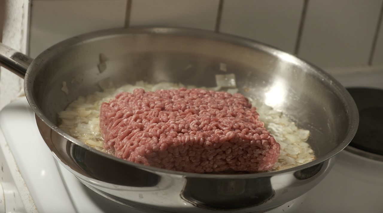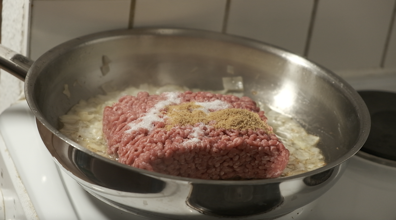 양파가 투명해지는 단계를 넘어 갈색으로 변하기 시작하면 간 소고기(or 양고기) 500g를 넣습니다.