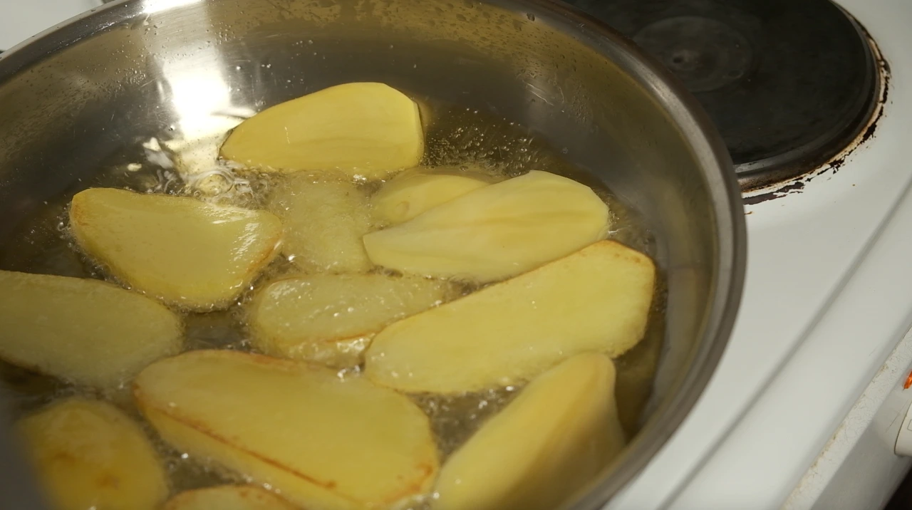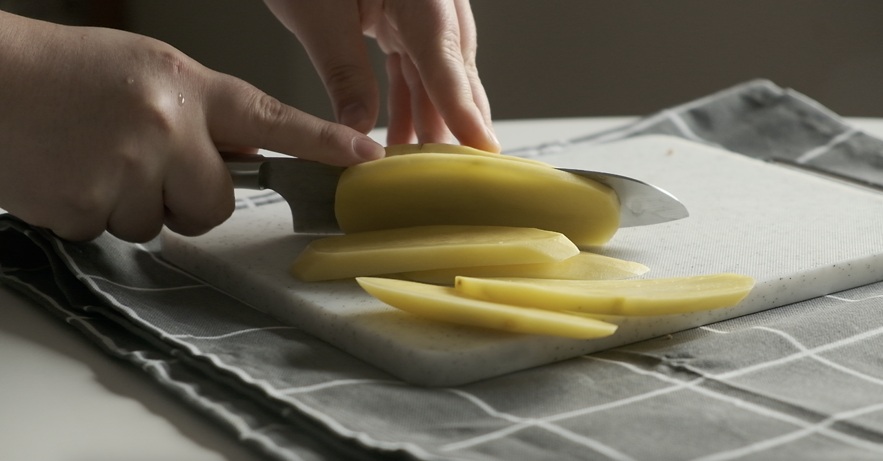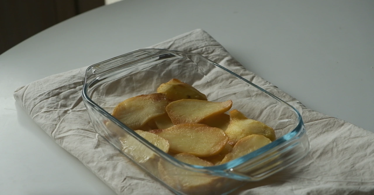 1cm 굵기로 썬 감자를 노릇해질 때까지 기름에 튀긴 후 1.5L 내열 용기 바닥에 깔아줍니다.