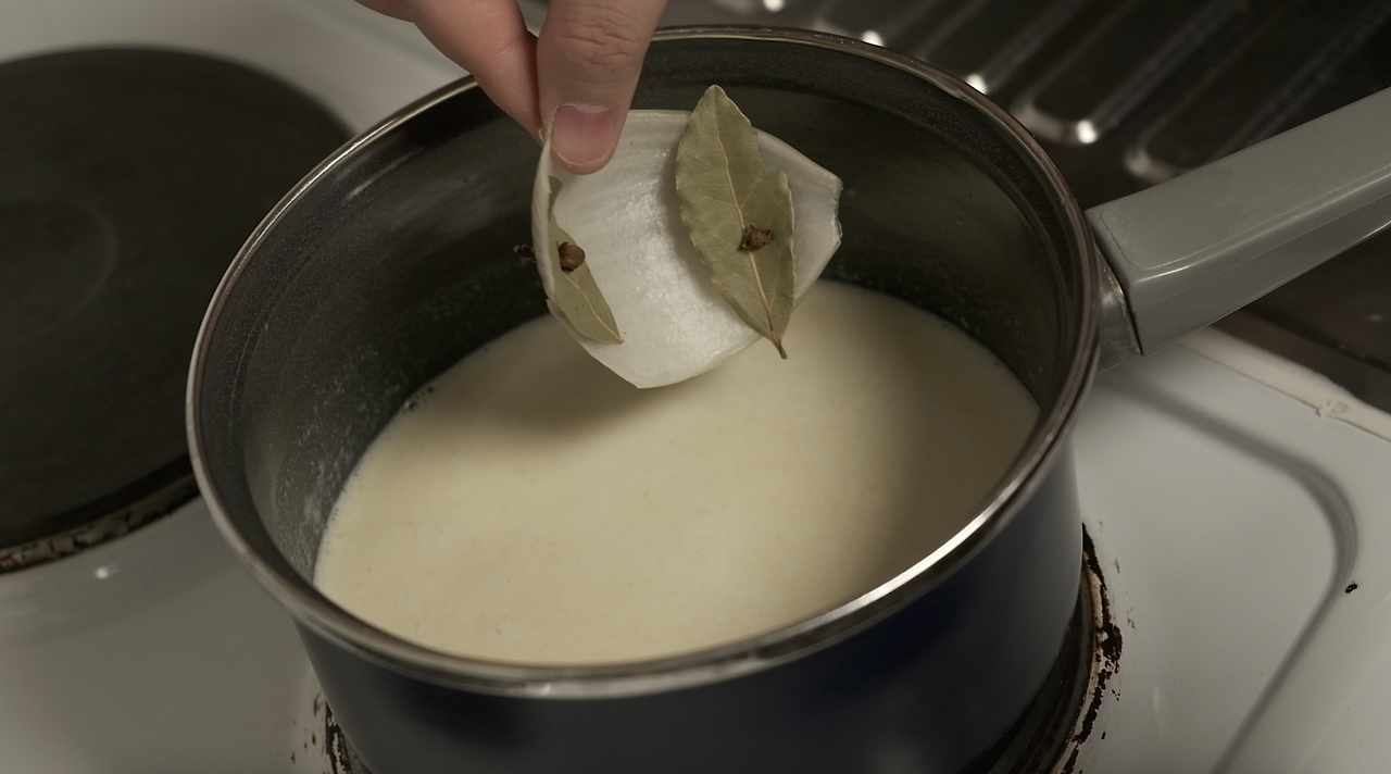 / 양파 한 조각, 정향 2, 월계수 잎 2(Onion Piqué)를 넣어 풍미를 더합니다.