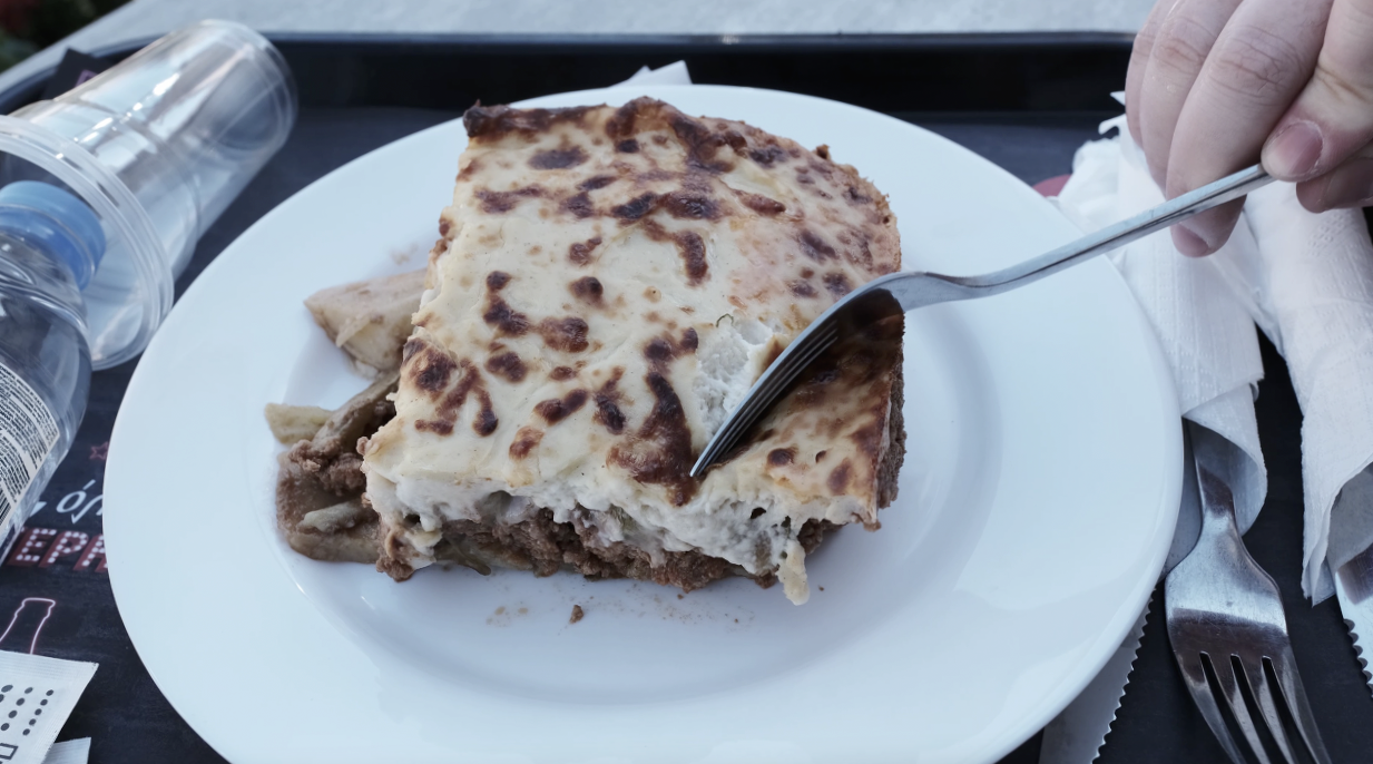 주섬주섬 짐 정리를 하려는 찰나에 음식이 담긴 접시가 테이블에 놓입니다. 채도가 빠진 라자냐 모양새입니다. 땅따먹기를 하듯 무사카의 귀퉁이 영역을 떼어내 입으로 가져갑니다.