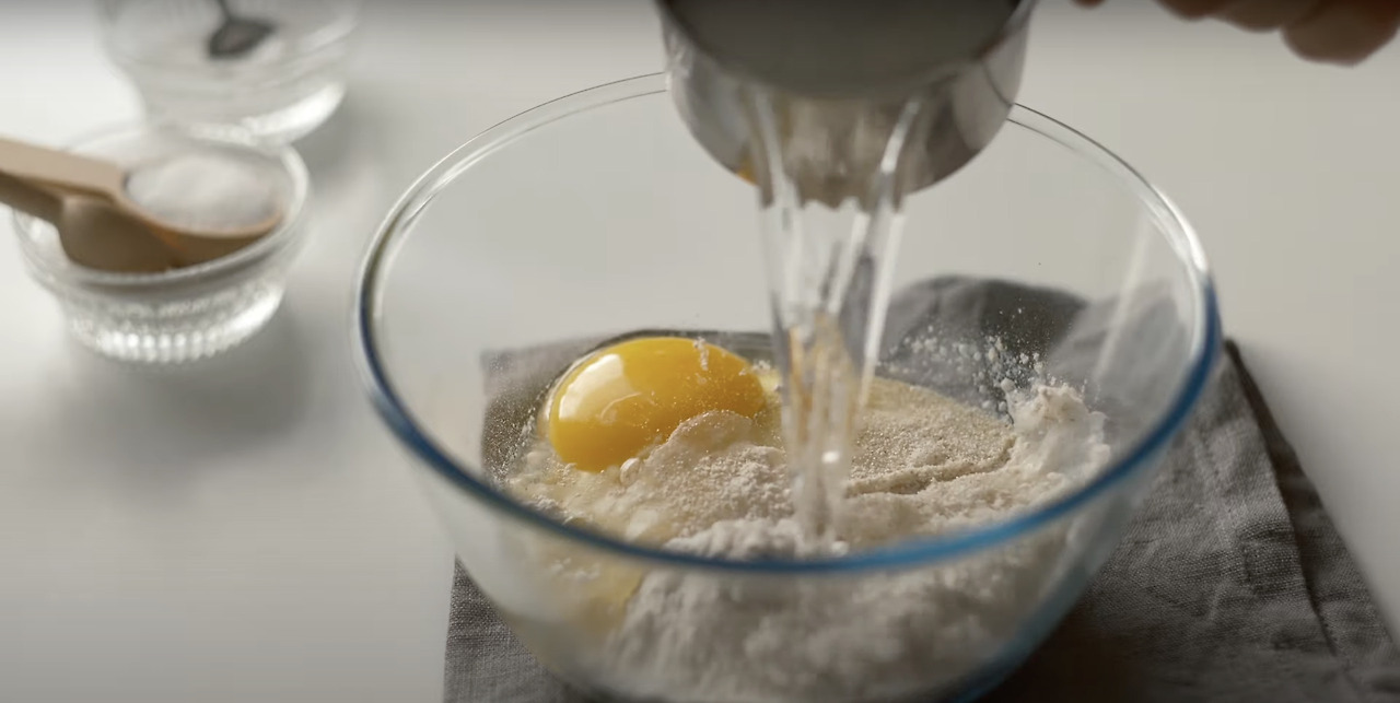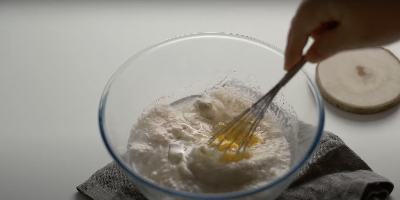메밀가루에 달걀, 물, 소금, 설탕, 식용유를 넣고 잘 섞어줍니다.