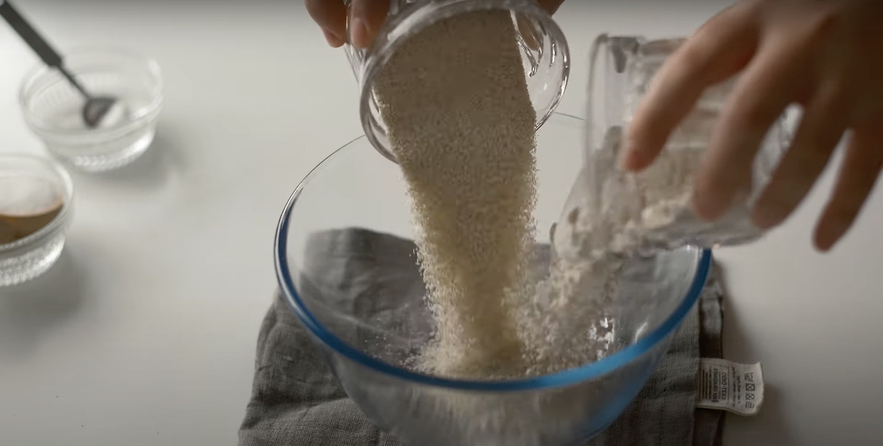 거친 메밀가루와 고운 메밀가루를 1:1로 섞어줍니다.