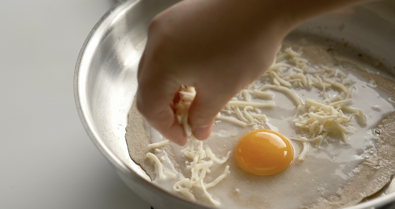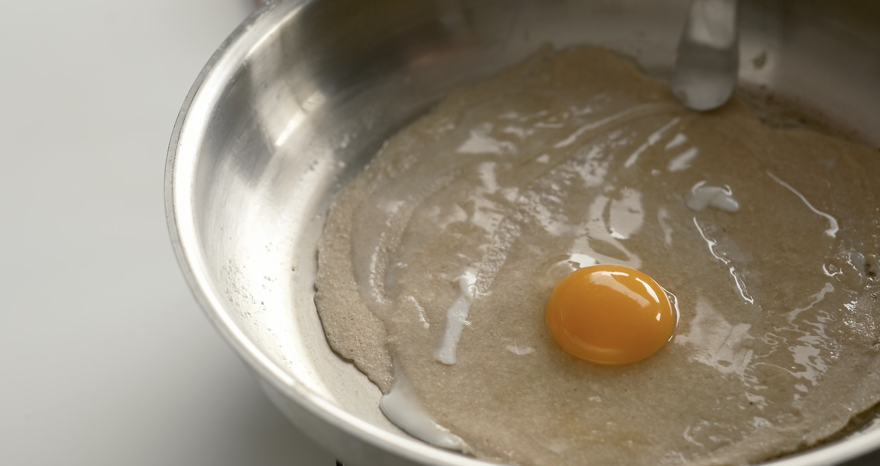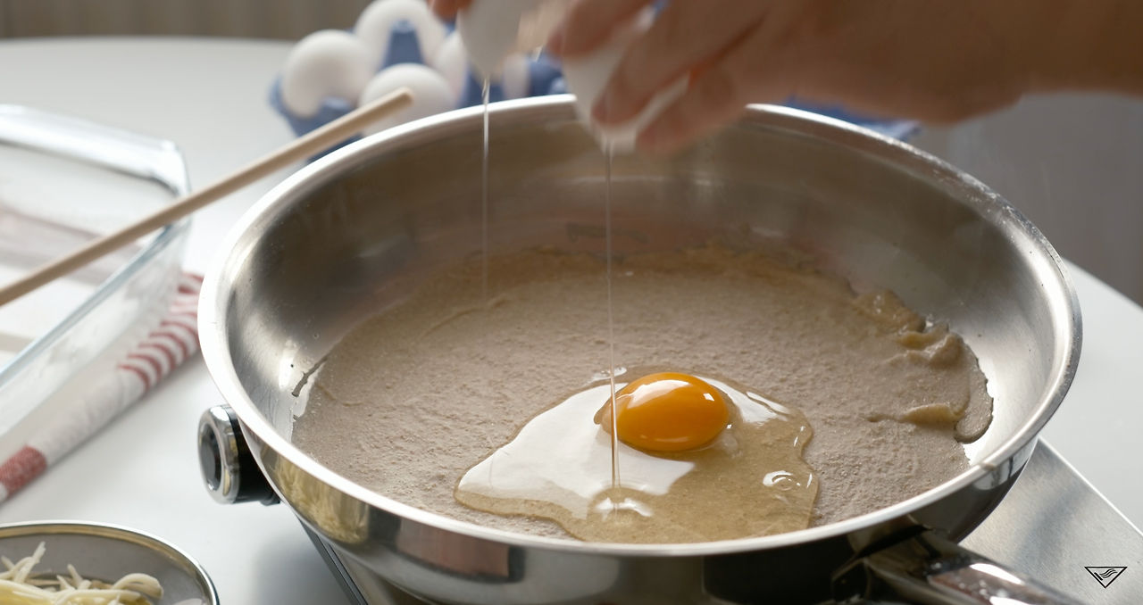 반죽이 익으면 달걀을 올리고 흰자가 반죽면 전체를 덮도록 넓게 펴줍니다.