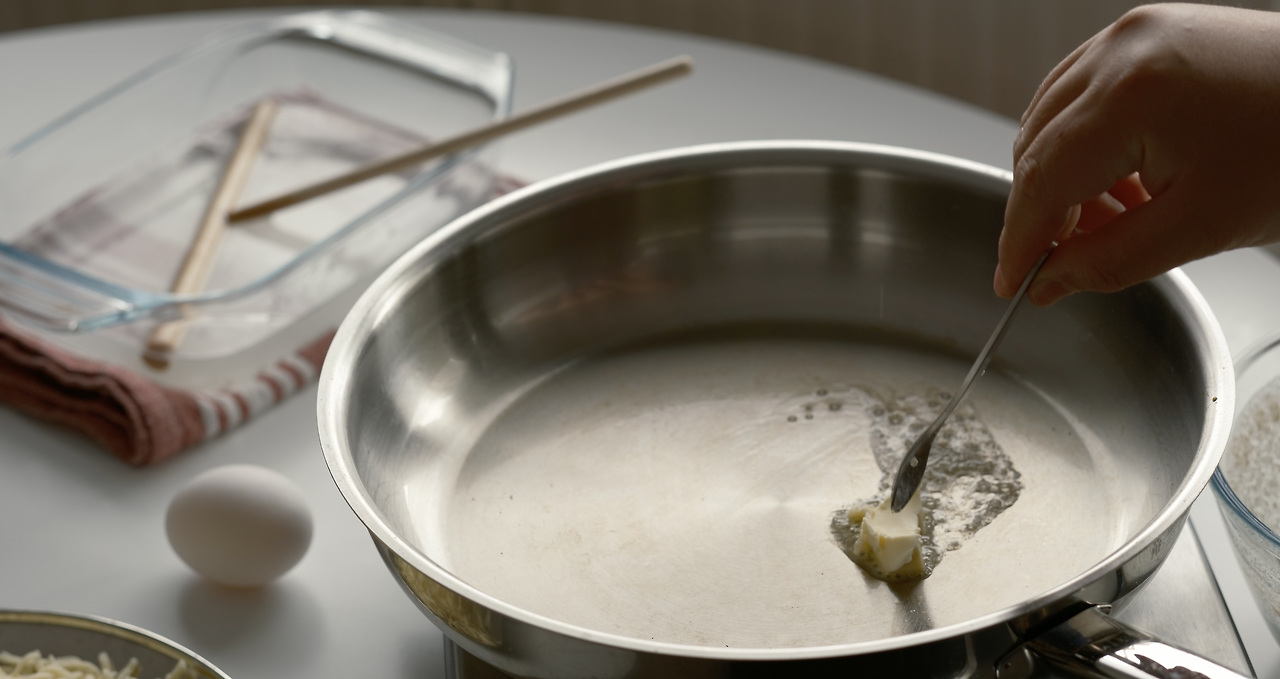 예열된 팬에 버터를 두른 뒤 메밀 반죽을 얇게 펴줍니다.