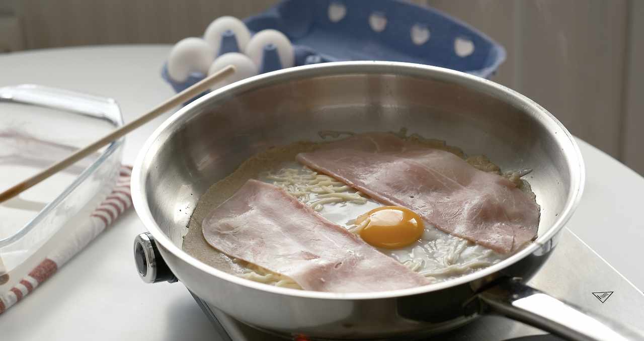 흰자가 하얗게 익으면 그 위로 치즈와 햄까지 휘리릭