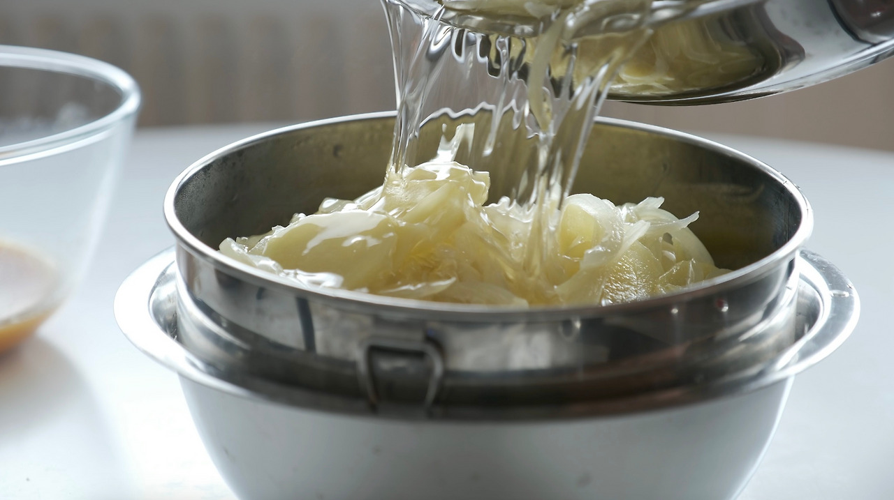 10분이 지나면 야채와 기름을 걸러줍니다.