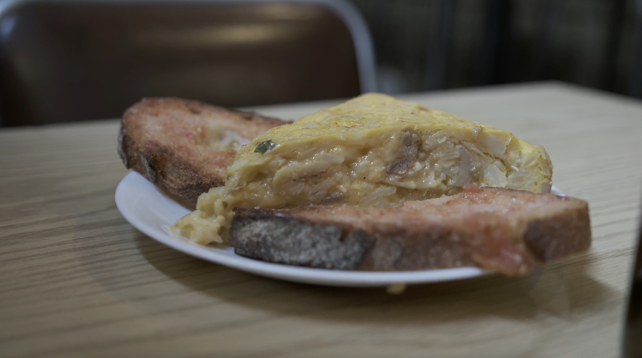 기름에 튀긴(천천히 익힌) 야채를 걸러낸 뒤 바로 달걀물에 넣어줍니다. 야채의 잔열이 달걀의 온도를 올리고 이를 팬에서 빠르게 겉면만 익혀낸 오믈렛입니다. 달걀물이 주르륵 흐르지는 않지만 익지 않은 상태. 딱 이 오믈렛 식감을 많은 스페인 사람들이 선호합니다.