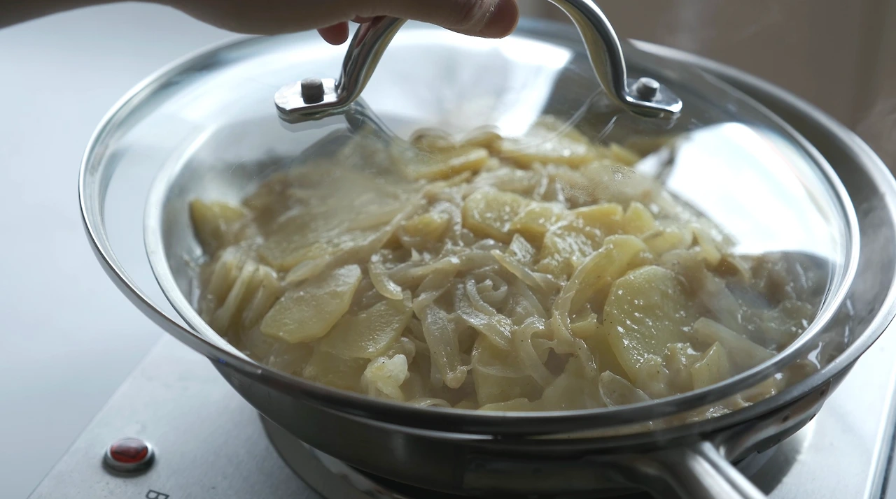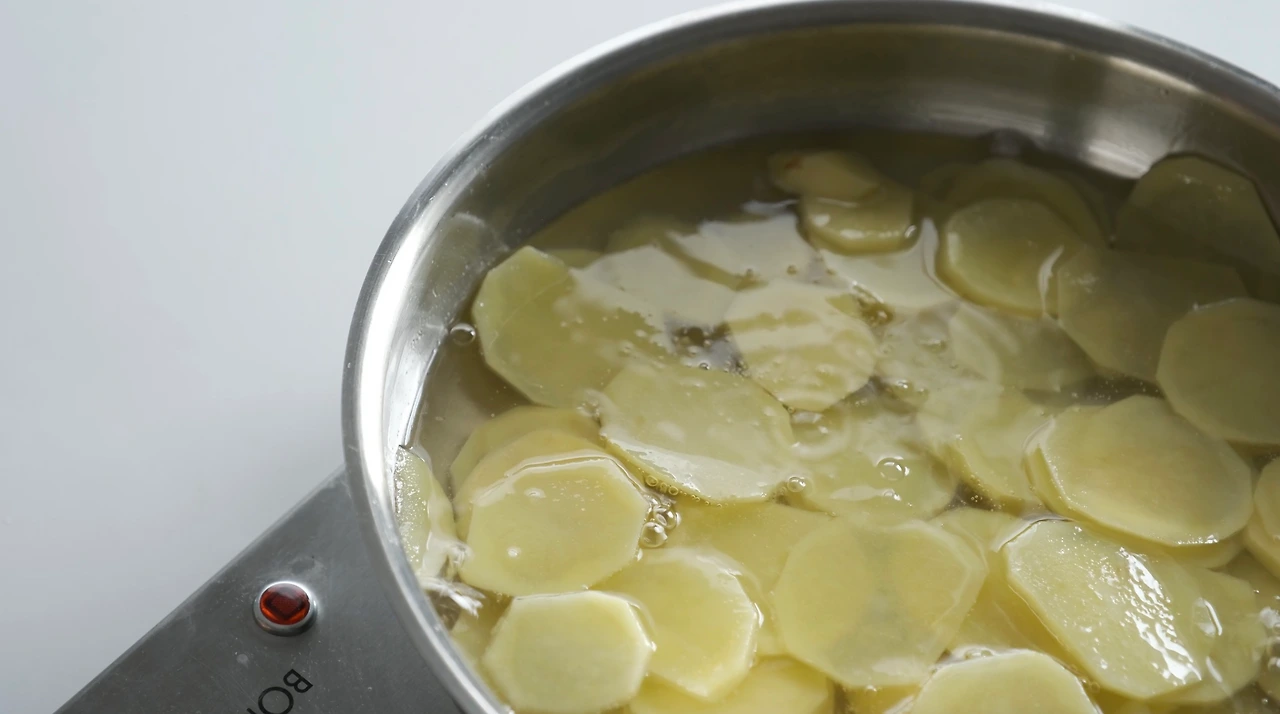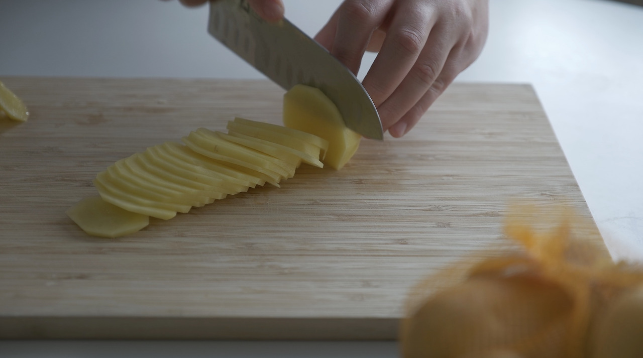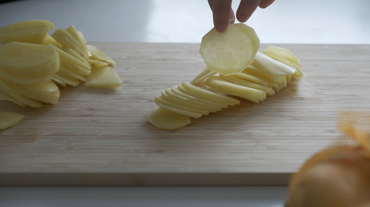 3mm 두께로 감자와 양파를 썬 뒤, 100도로 예열된 기름에 10분간 익혀줍니다.