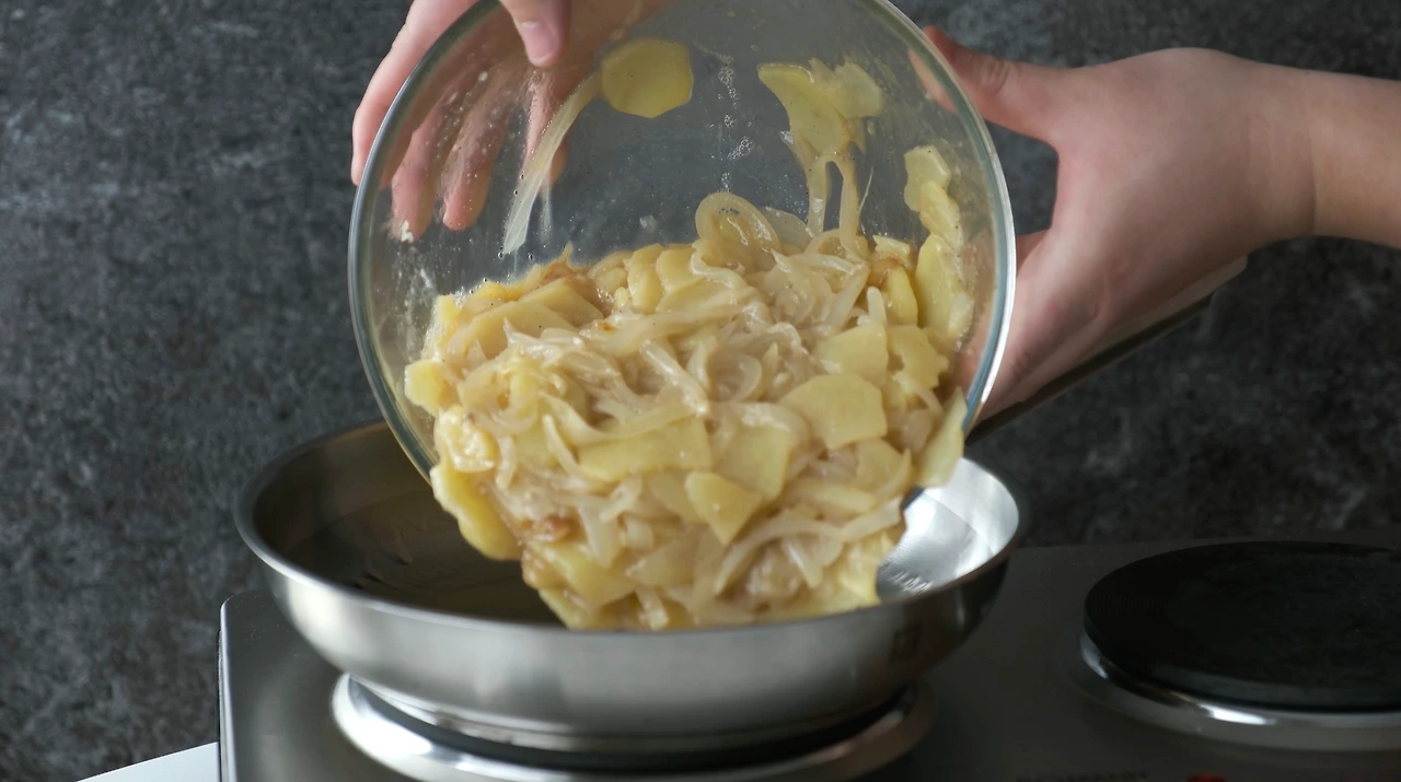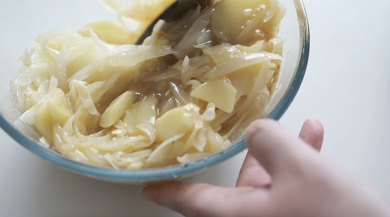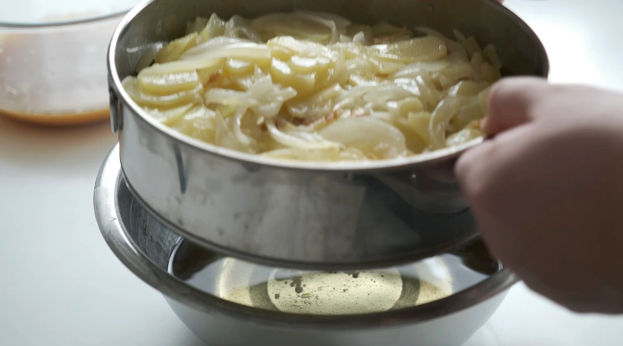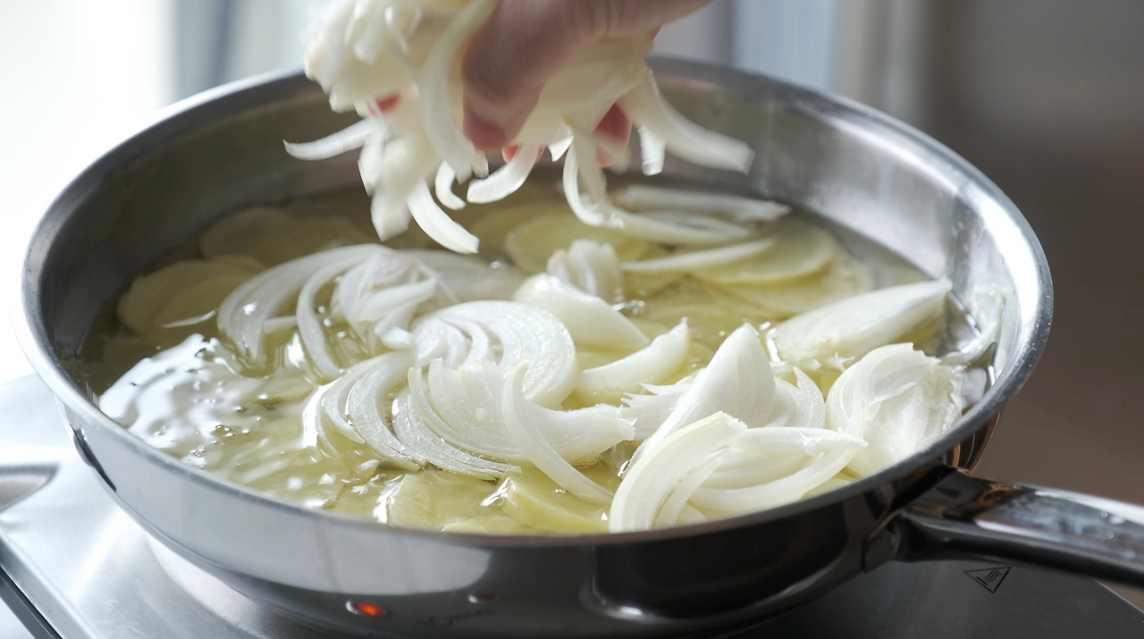 3mm 두께로 감자와 양파를 썬 뒤, 100도로 예열된 기름에 10분간 익혀줍니다.
