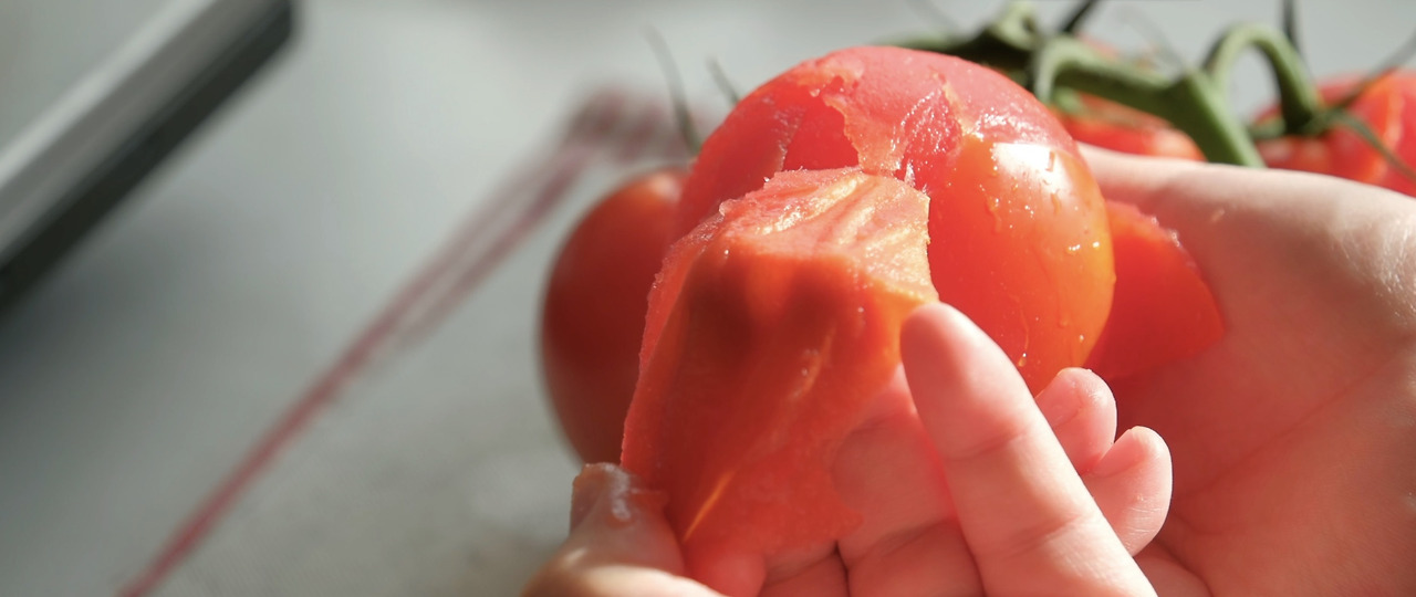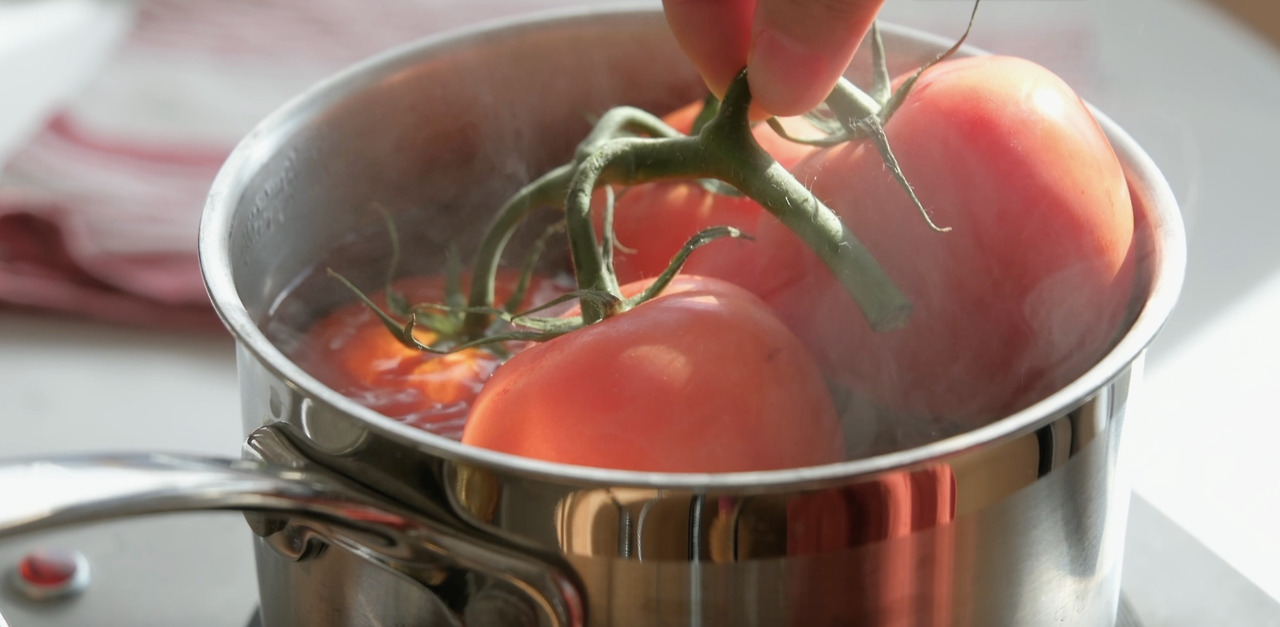 1. 끓는 물에 토마토를 넣고 30초간 데친 뒤 껍질을 제거합니다.