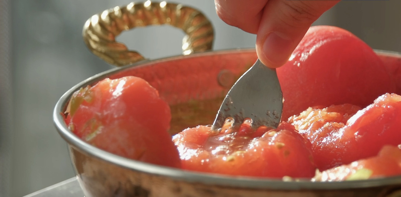 3. 껍질을 제거한 토마토를 고추 볶던 팬에 넣은 뒤 포크로 잘 으깨줍니다