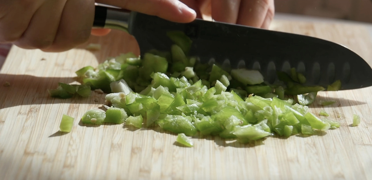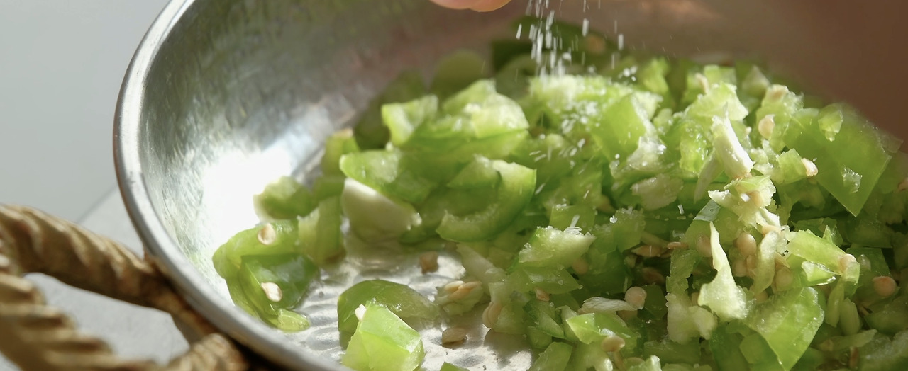 2. 팬에 버터와 다진 고추, 소금 한 꼬집을 넣은 뒤 볶아줍니다.