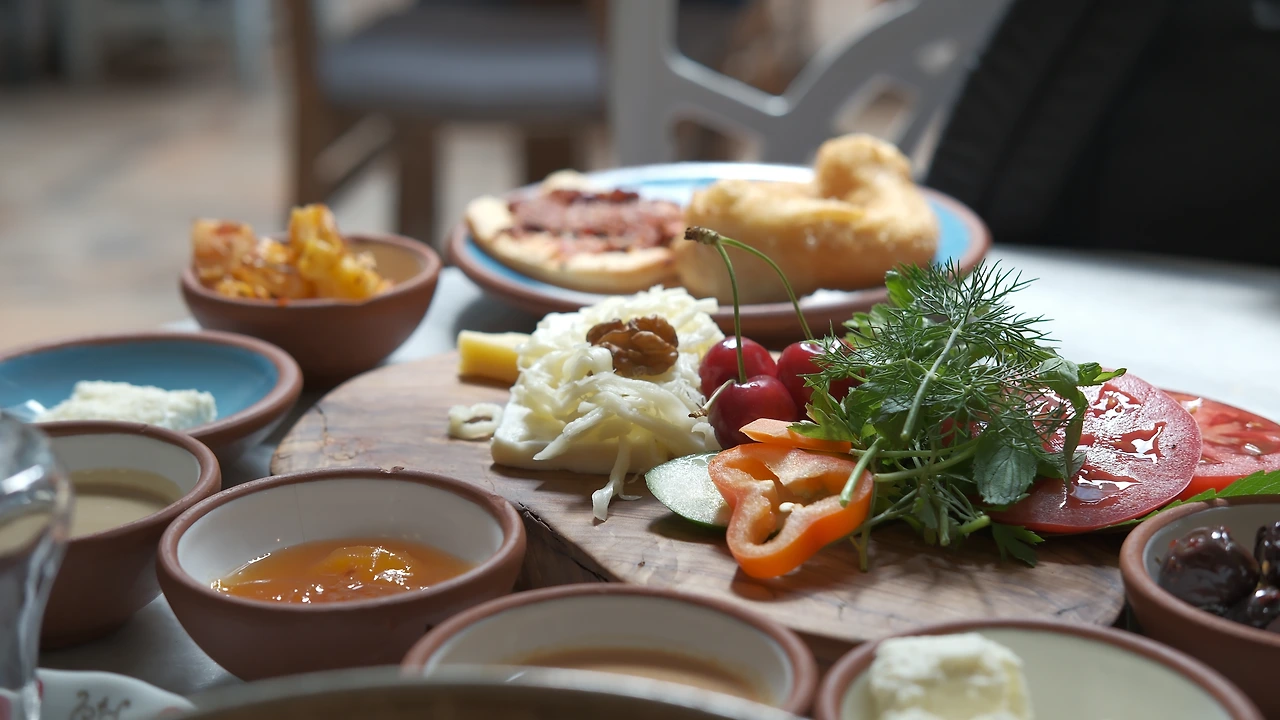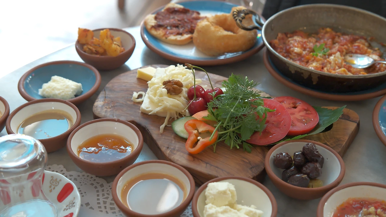 튀르키예 곳곳의 식당 혹은 커피숍에서는 아침식사 카흐발트kahvaltı를 팝니다. 빵과 어울리는 음식들이 잔뜩 모인 한 상이라고 생각하시면 됩니다. 빵과 잼, 야채 정도의 간결한 구성이 일반적이라면 카흐발트를 메인으로 파는 식당에서는 다양한 식재료로 구성된 아침식사를 맛볼 수 있습니다.