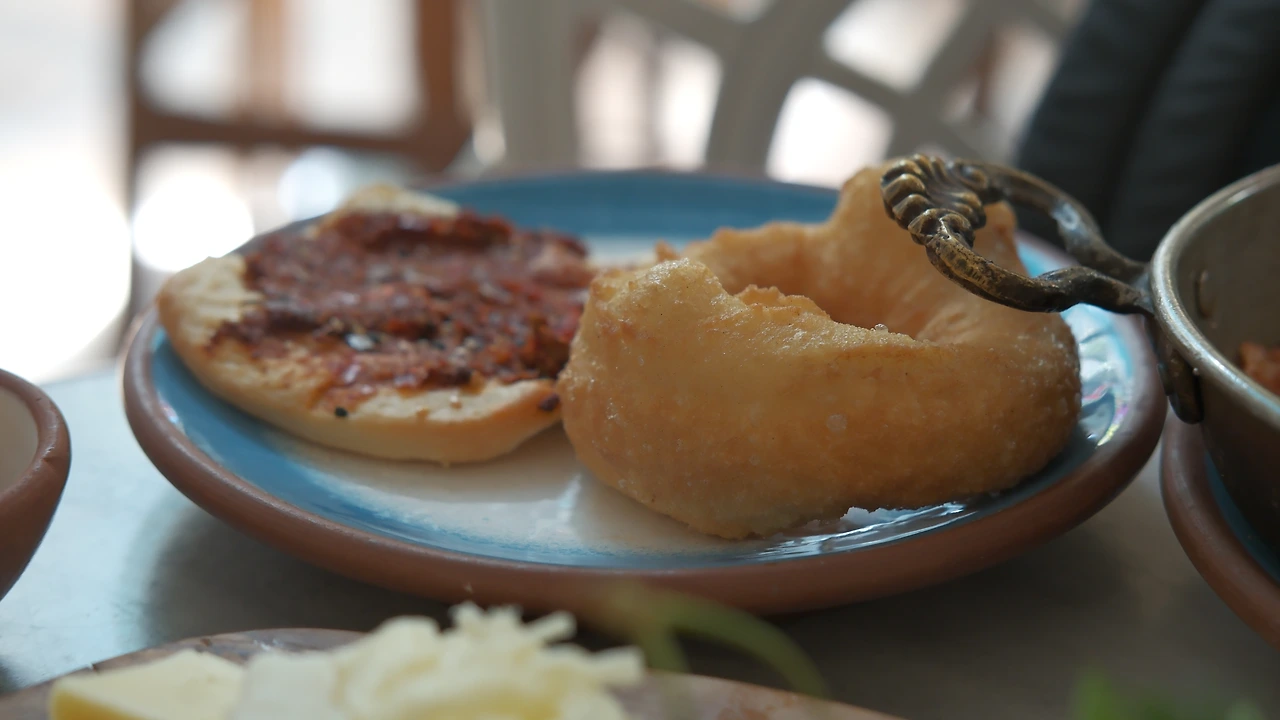 튀긴 빵 Pişi, 신선한 카이막과 꿀, Beyaz Peynir (튀르키예어로 Beyaz 흰색, Peynir 치즈), 강렬한 햇빛아래 잘 익은 올리브, 다양한 과일잼들이 작은 접시에 조금씩 담겨있습니다.