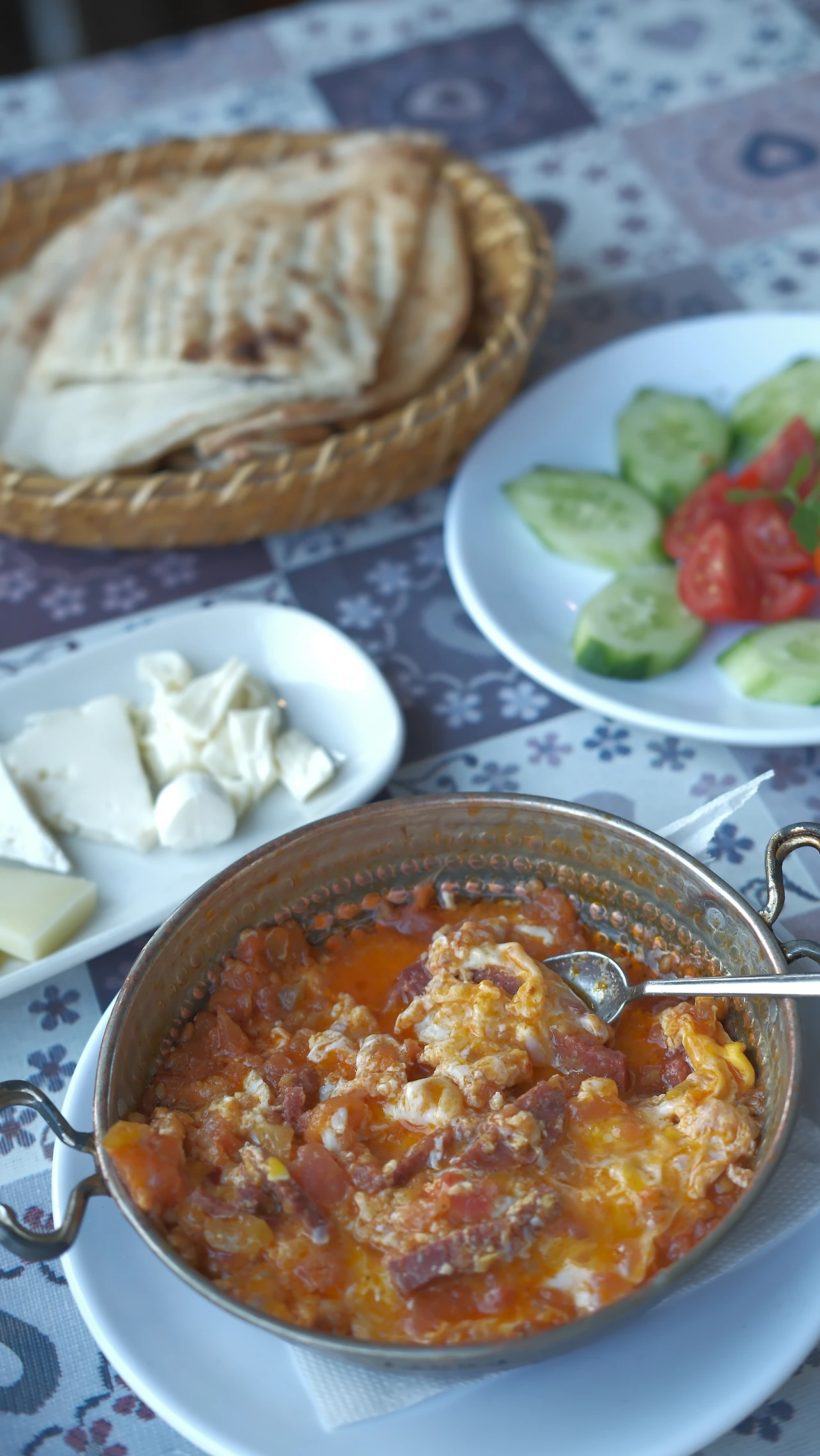 막 조리를 마친 따끈한 토마토계란볶음 메네멘menemen과 뜨끈한 홍차까지 테이블에 올라오면 푸짐한 터키식 아침식사 카흐발트kahvaltı 한 상이 완성됩니다.
