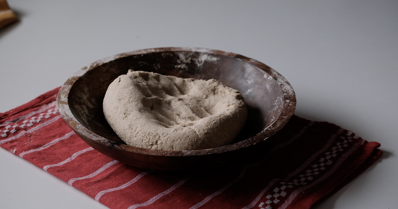 반죽을 한 덩이로 뭉친 뒤 천으로 덮어 실온에서 1시간 발효시킵니다.