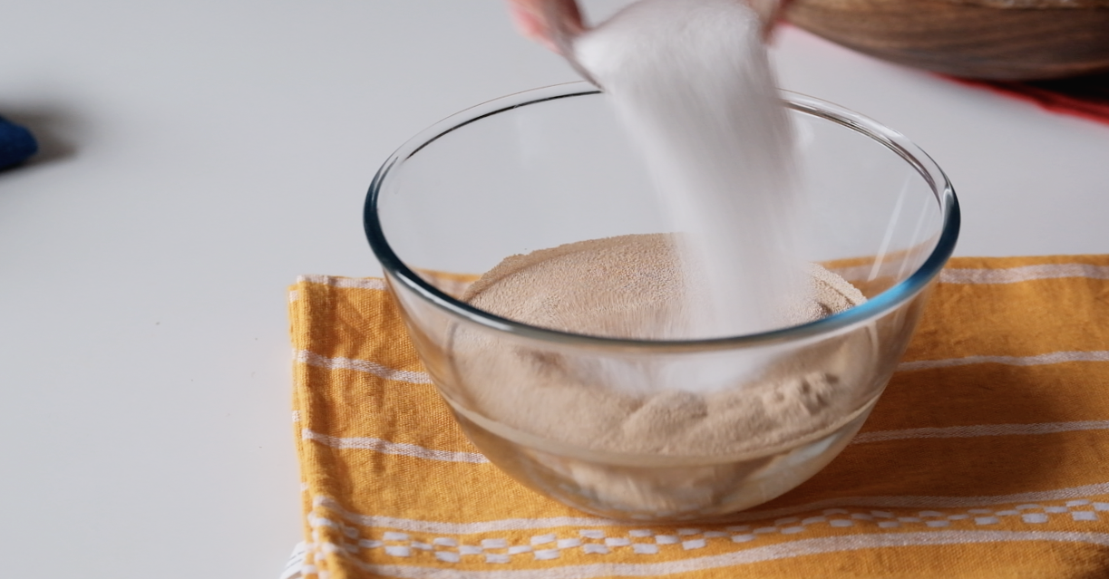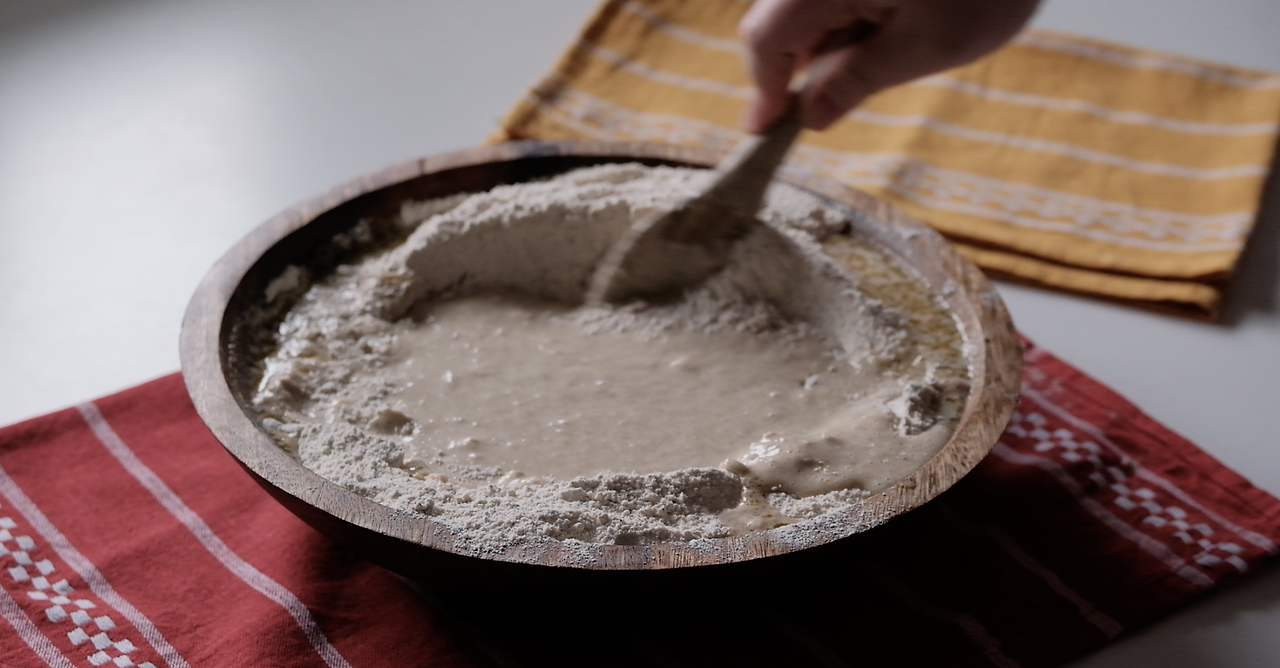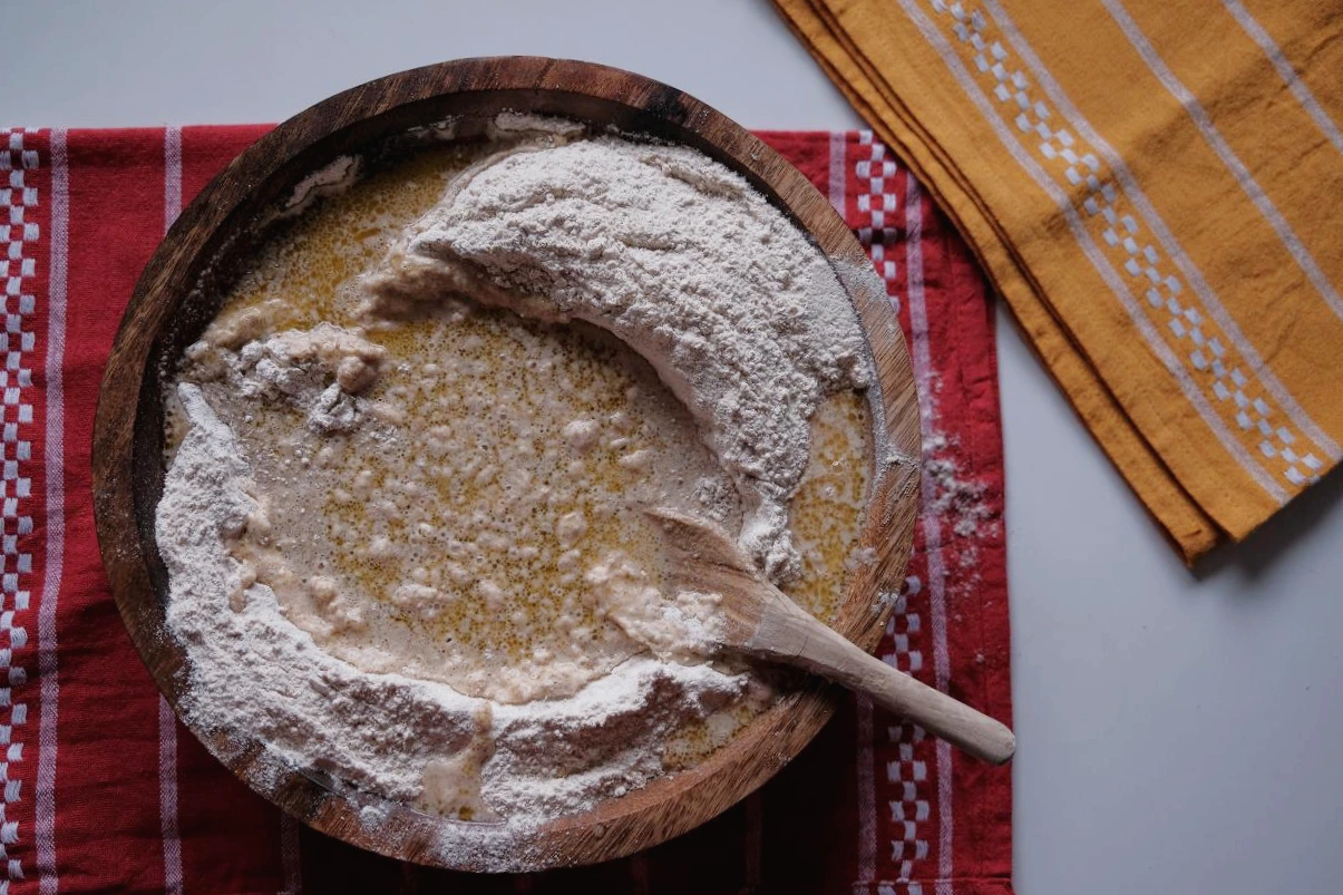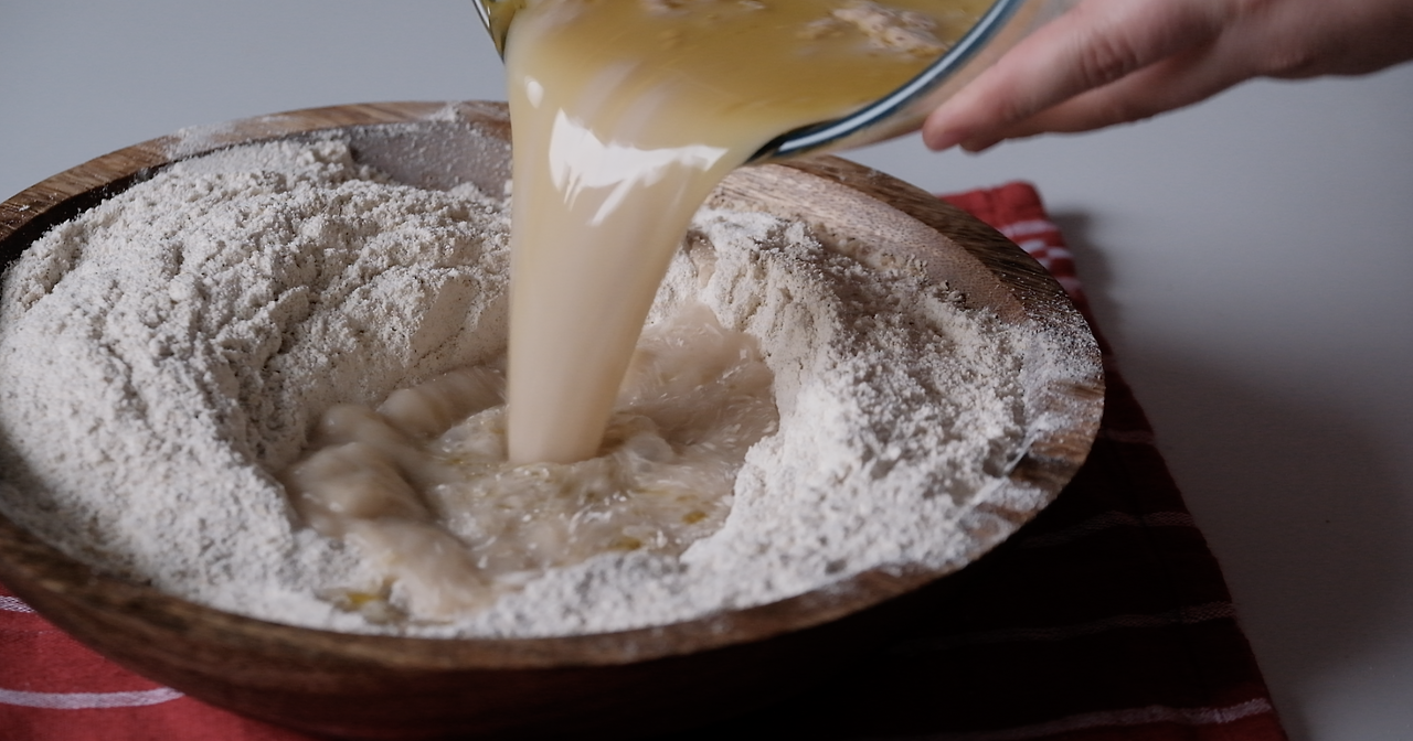 가루류 중앙에 충분한 홈을 만들어준 뒤 이스트 혼합물을 넣어줍니다.