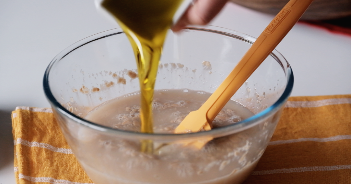 물 400ml에 이스트 15g, 설탕 2T(35g), 올리브유 40g을 넣고 잘 섞어줍니다.