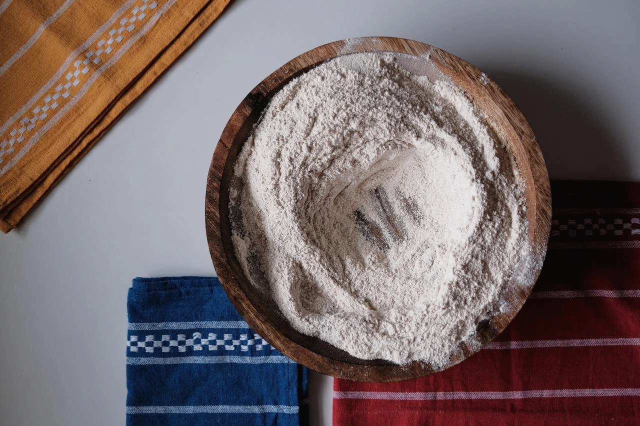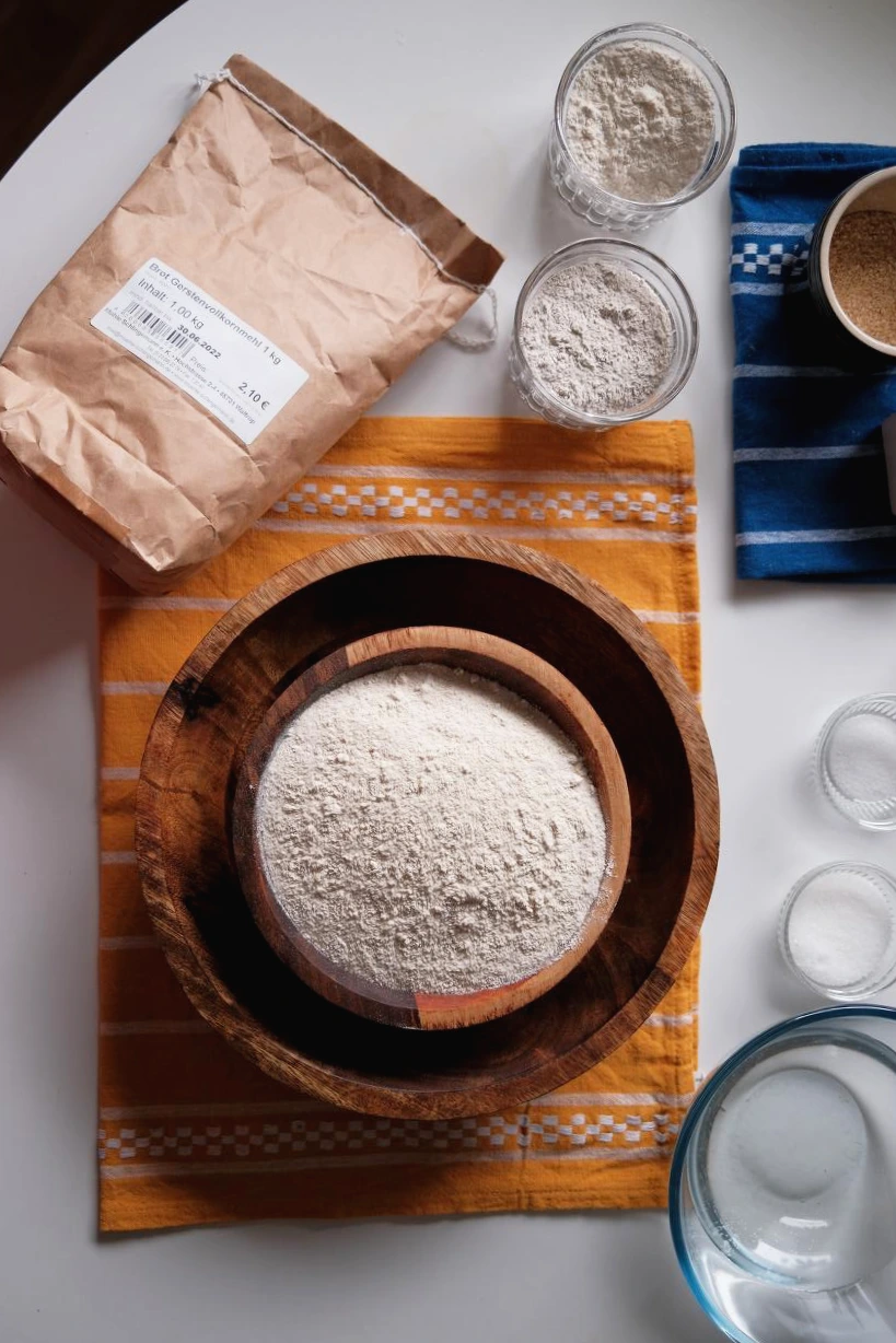 반죽할 수 있는 넓은 보울에 보릿가루 300g, 밀가루 100g, 통밀가루 100g, 거칠게 빻아진 보리등겨가루 30g, 소금 1t(5g)을 넣고 잘 섞어줍니다.