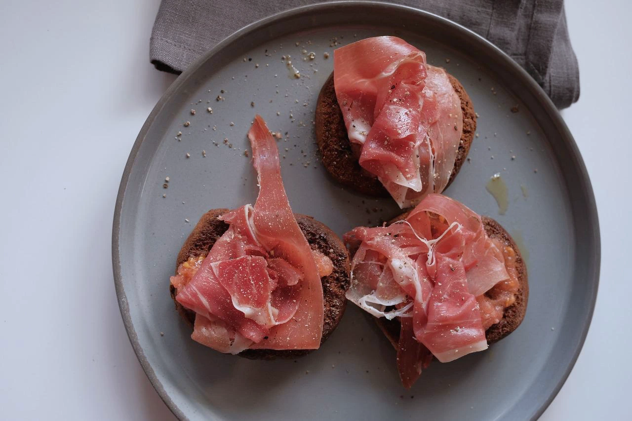 러스크의 거친 표면에 생마늘의 단면을 문질러 진액을 바르고 올리브 오일을 뿌려줍니다. 그 위에 토마토 과육과 하몽을 올리면 스페인식 '브루스케타'가 완성됩니다.