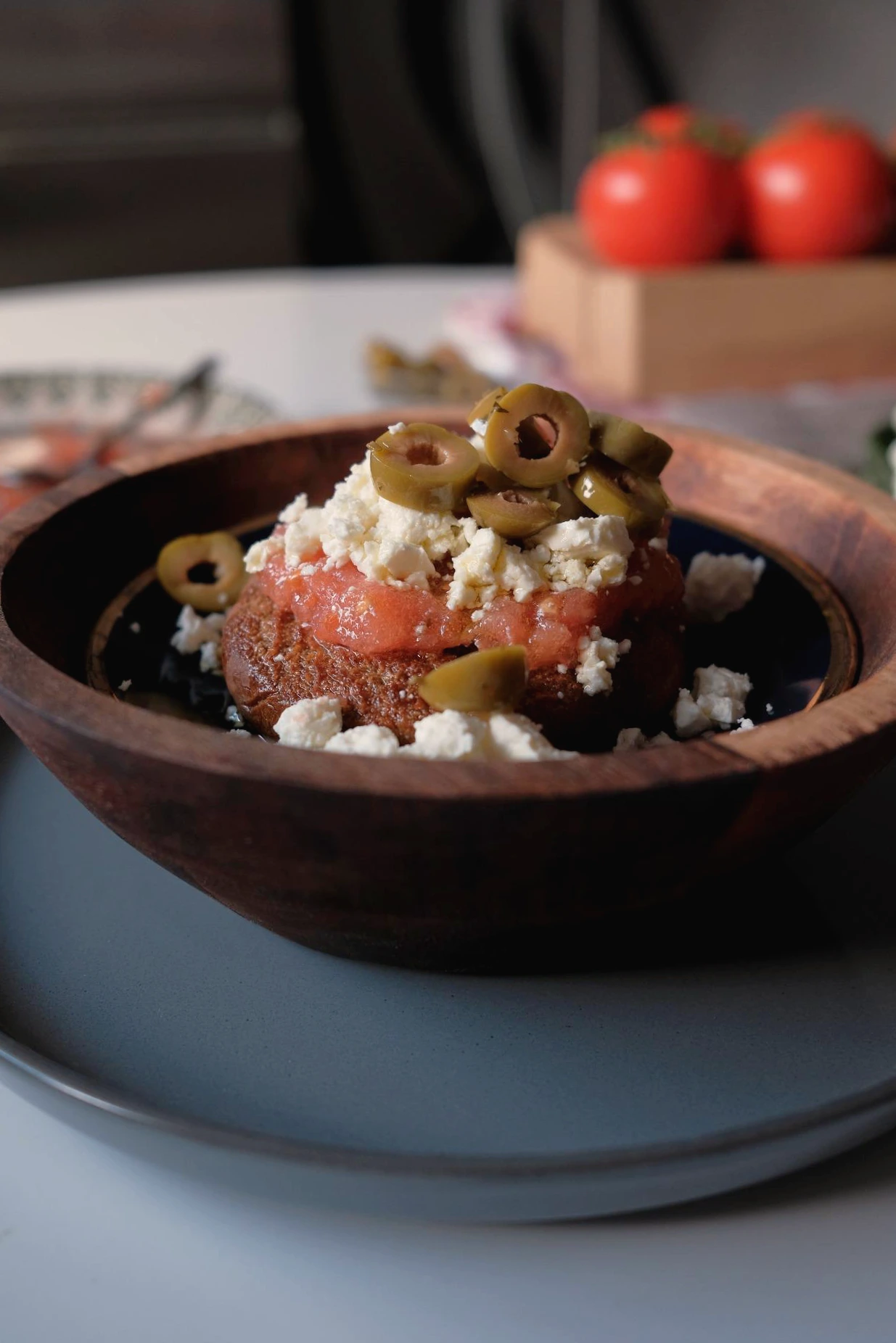 완성된 팍시마디아(러스크)를 물에 가볍게 넣었다 빼서 수분감을 준 뒤 빈 접시 위에 올립니다. 굵은 구멍을 가진 강판으로 단단한 토마토를 갈아 러스크 위에 얹고 그 위로 미지트라치즈(페타 치즈로 대체 가능)를 올립니다.