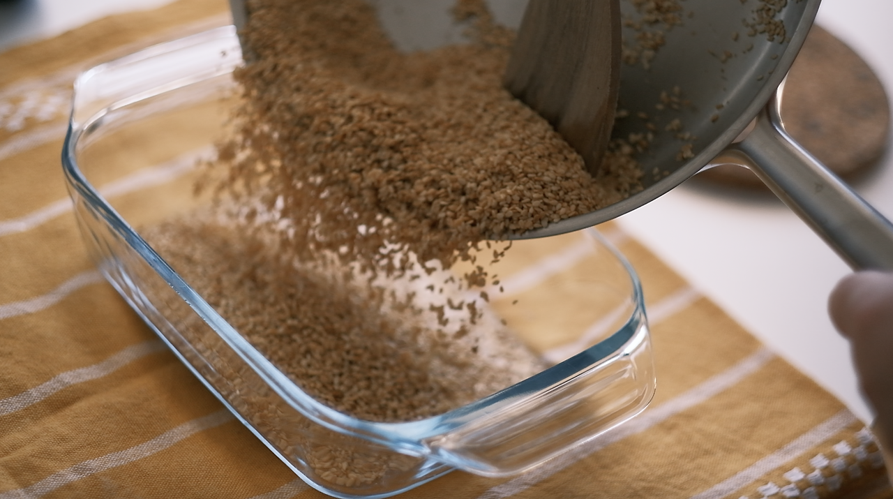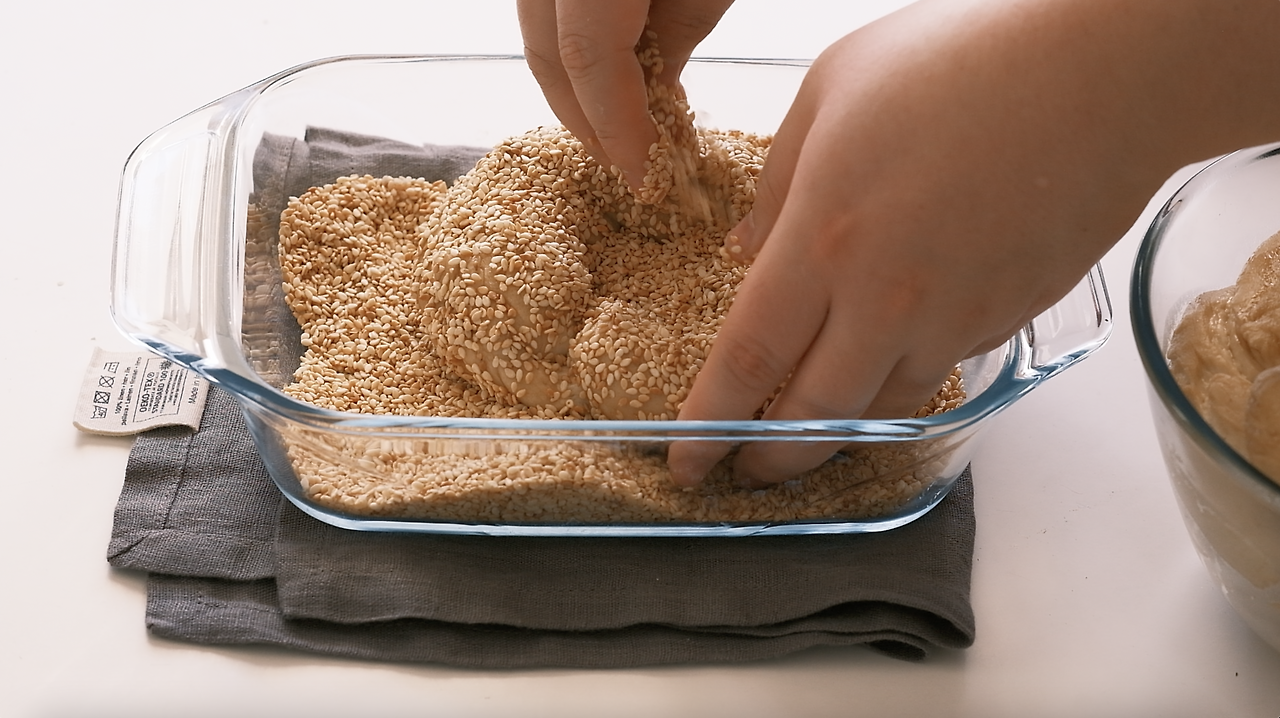 끈적한 시럽 물이 묻은 반죽 표면에 볶아둔 깨를 잔뜩 묻혀줍니다.