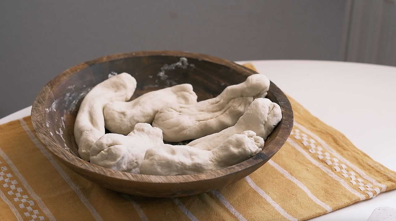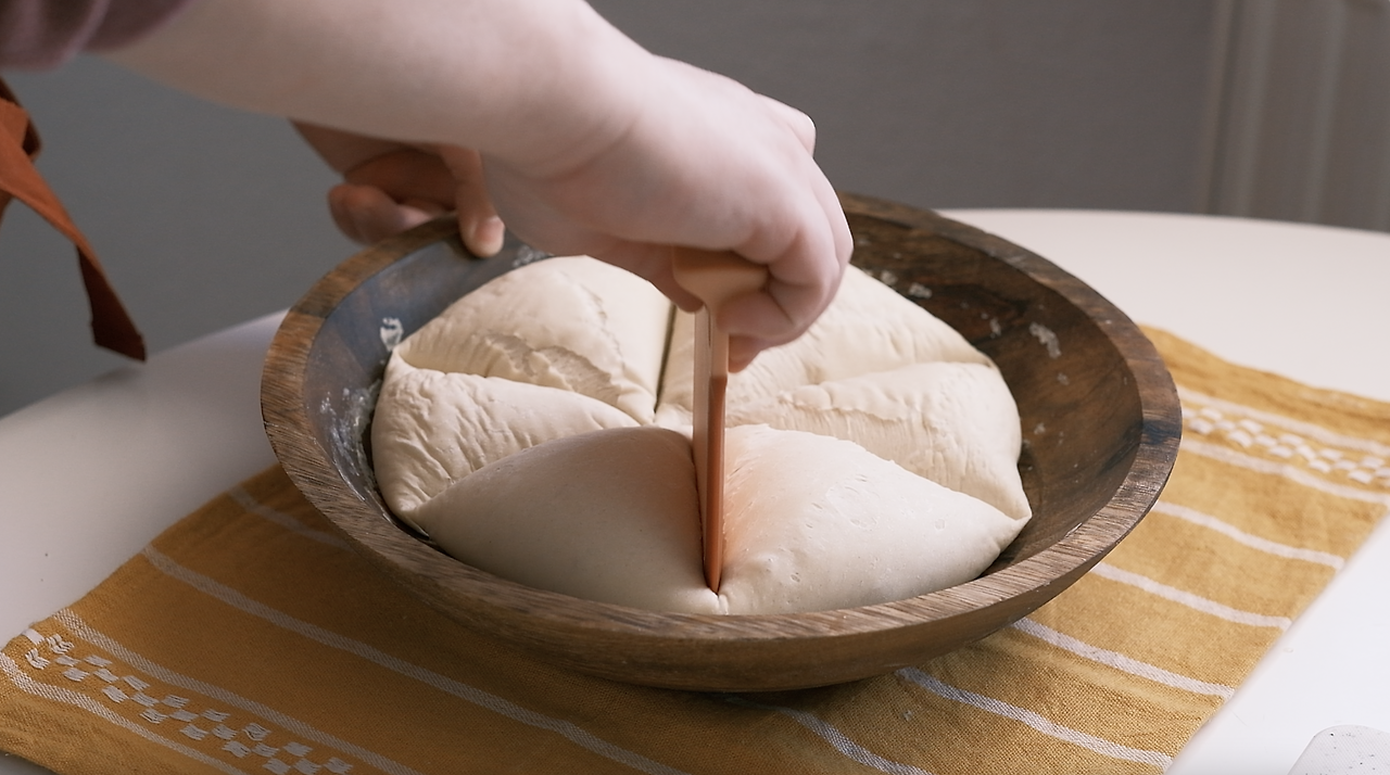 1차 발효가 끝난 반죽은 가스를 빼주고 6개로 분할합니다. 길쭉하게 모양을 잡은 뒤 20분간 2차 발효합니다.