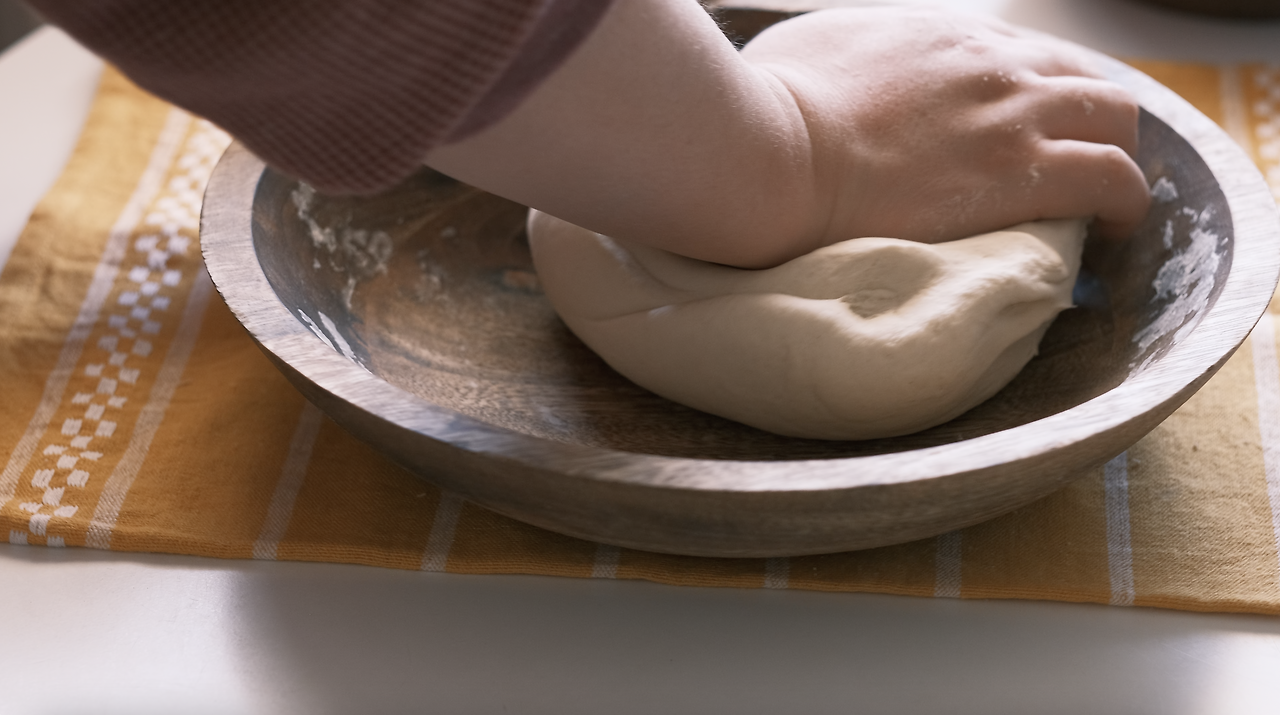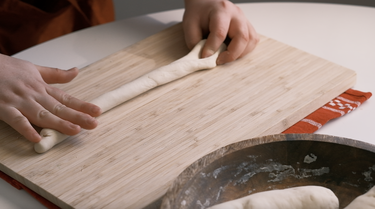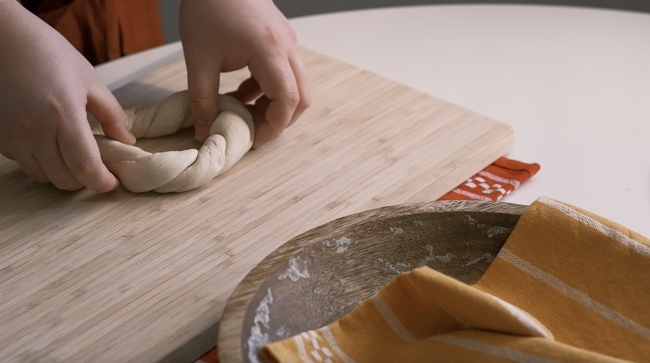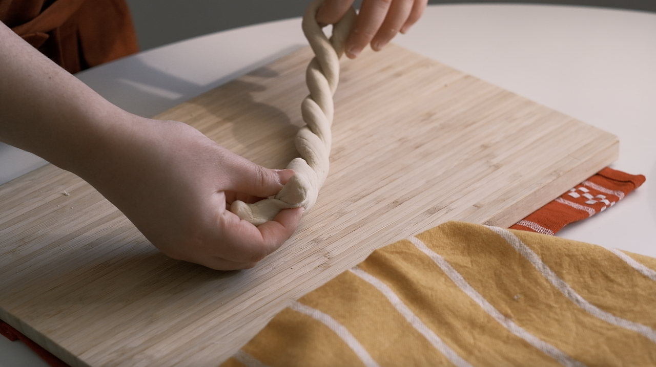 발효가 끝난 반죽을 길게 늘린 뒤 반으로 접어 꽈배기 모양으로 꼬아줍니다.