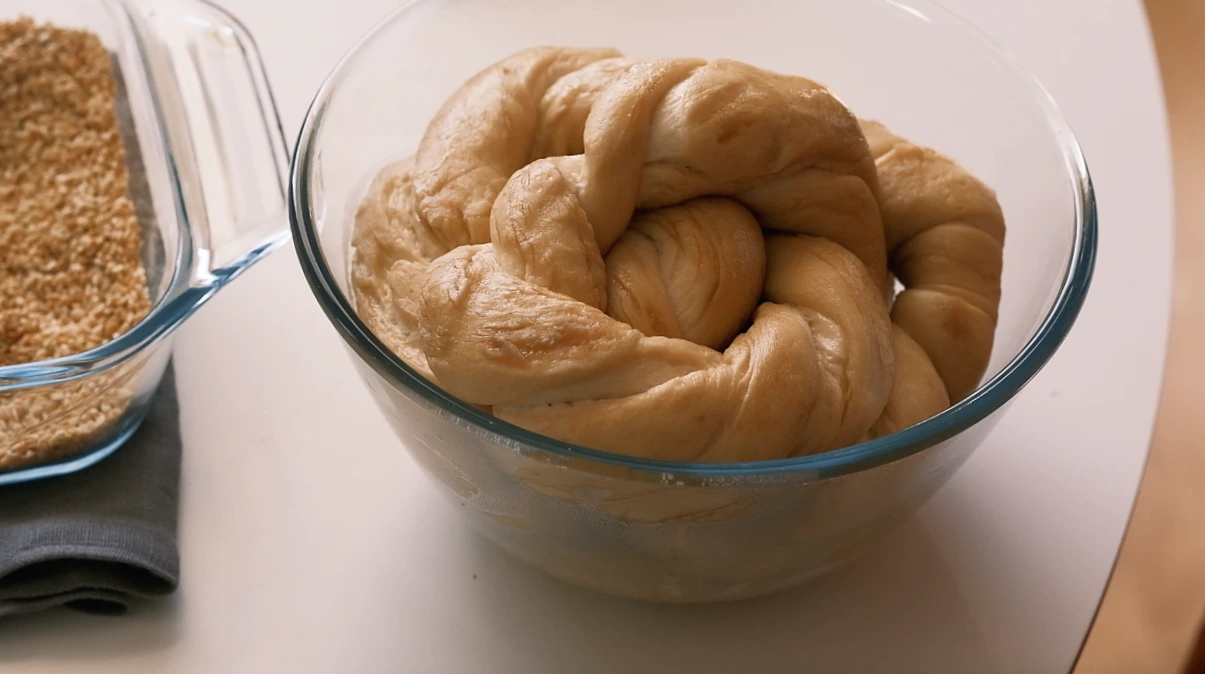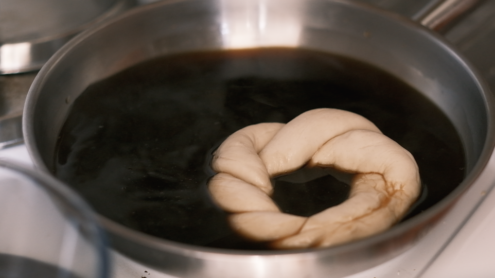 발효를 마친 반죽이 뜨거운 온도에 노출되면 반죽 껍질 부분부터 효모의 운동성이 제거됩니다. 이 상태에서 오븐으로 들어가면 발효가 멈춘 겉 반죽으로 인해 반죽의 형태가 단단하게 고정됩니다. 부푸는 영역이 제한되어 밀도가 높고 쫄깃한 식감의 빵이 만들어집니다. 하지만 뜨거운 물에서 반죽을 빨리 건져내지 않으면 반죽 안쪽의 효모까지 사멸해 부피가 지나치게 작은 빵이 만들어집니다.