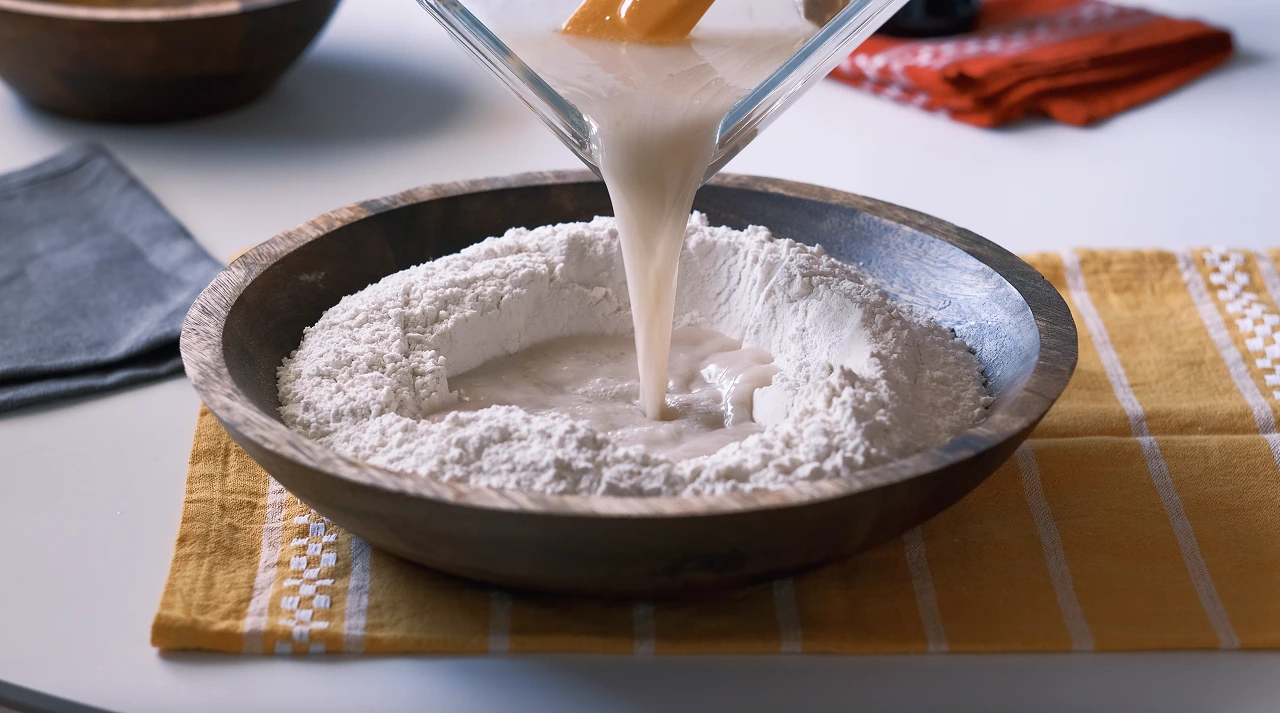 밀가루에 이스트 혼합물을 넣고 (팔에 감각이 없어질 때까지) 글루텐이 잡힐 때까지 반죽해줍니다.